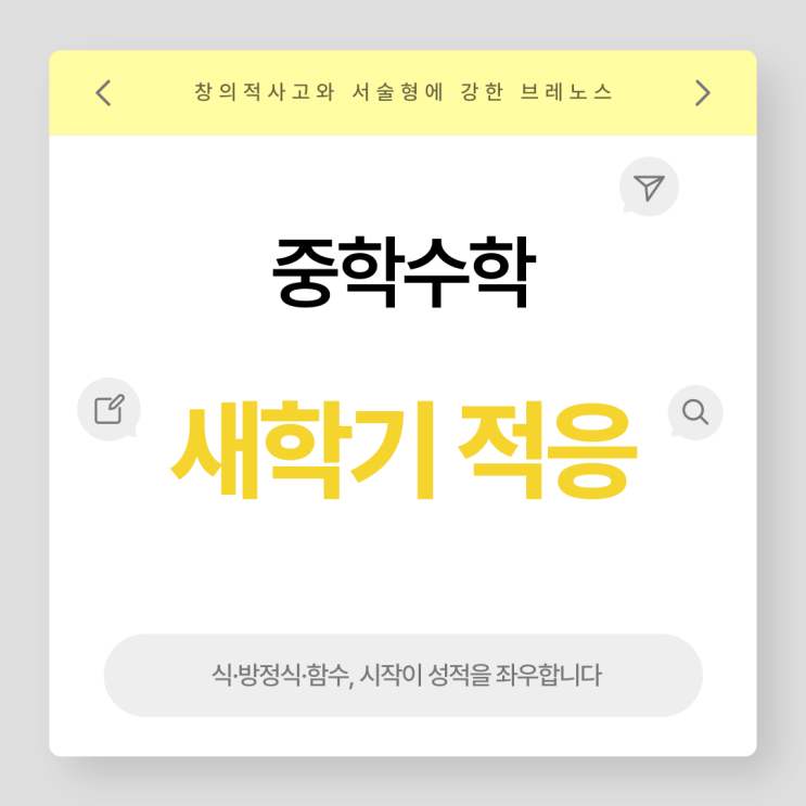 중학교 수학, 새학기 적응이 중요한 이유 중학교 수학은 단순히 난이도가 올라가는 단계가 아닙니다. 초등 수학이 계산 중심이었다면, 중학교부터는 개념 이해와 논리적 사고 중심으로 전환됩니다. 특히 중1, 1학기에는 식의 계산, 방정식, 함수가 동시에 시작되며, 이 시기 적응 여부가 이후 수학 실력에 큰 영향을 줍니다. 실제로 현장에서는 같은 시간 공부를 해도 개념을 이해한 아이와 반복만 한 아이의 격차가 빠르게 벌어집니다. 그래서 새학기에는 문제 풀이량보다 이해 방식 점검이 더 중요합니다. 식의 계산, 계산보다 ‘이해’가 먼저입니다 문자를 처음 접하는 식의 계산은 많은 학생들이 어려워하는 단원입니다. 하지만 핵심은 계산....... <img src="https://blogthumb.pstatic.net/MjAyNjAzMjZfMTE2/MDAxNzc0NDcwMTAyNDQ1.RYp3uRz21RqtjLN0X2AD35LndQ4AV-Ww1YBUoMu-lQcg.MHcJIWupYDNyg4vUIZgbjmGBfZRs4SNXy2YjRpUSfd0g.PNG/001.png?type=s3" />