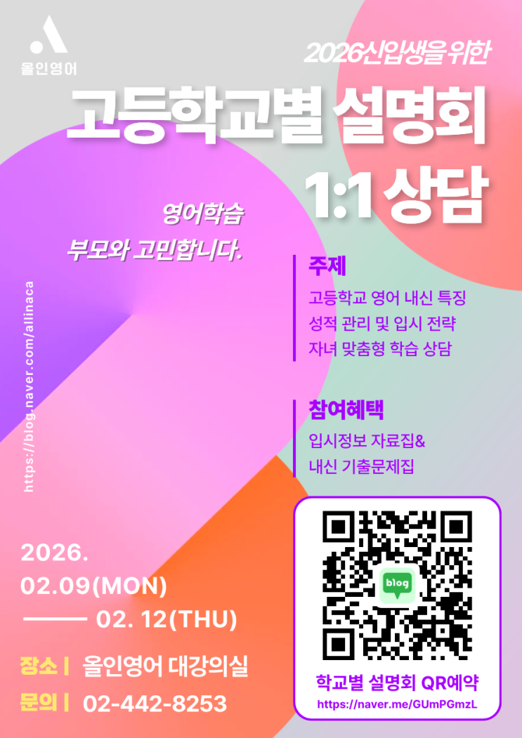 고등학교별 설명회 및 1:1 상담을 진행합니다. 26년 2월 9일(월)-12일(목) <설명회예약> ▶https://naver.me/GUmPGmzL *예약 전 학교별 설명회 요일확인 필수! ▶한영고설명회/2월12일(목)PM7시 ▶배재고설명회/2월9일(월)PM7시 ▶광문고설명회/2월10일(화)PM7시 ▶성덕고설명회/2월11일(수)PM7시 ▶강동고설명회/2월11일(수)PM8시 ▶강일고설명회/2월11일(수)PM7시 ▶상일여고설명회/2월10일(화)PM8시 ▶선사고,명일여고는 1:1 상담으로 진행됩니다 (내신반은 진행될 예정입니다) 장소 | 올인영어학원 대강의실 문의 | 02-442-8253 *사전예약필수 *입시정보 자료집&내신 기출문제집 제공 ☎문의/02-442-8253 <img src="https://blogthumb.pstatic.net/MjAyNjAxMjlfMTUg/MDAxNzY5NjgwNzgzMjI0.cI31Q511TvtSjzdvH93kNSYWLHg7vNG3BFVrZ71OVRQg.AYOVUnjR9Ym6zyfyYgO4p04DUJL_COC5lCQCGCmbGbcg.PNG/%BC%B3%B8%ED%C8%B8_1.png?type=s3" />