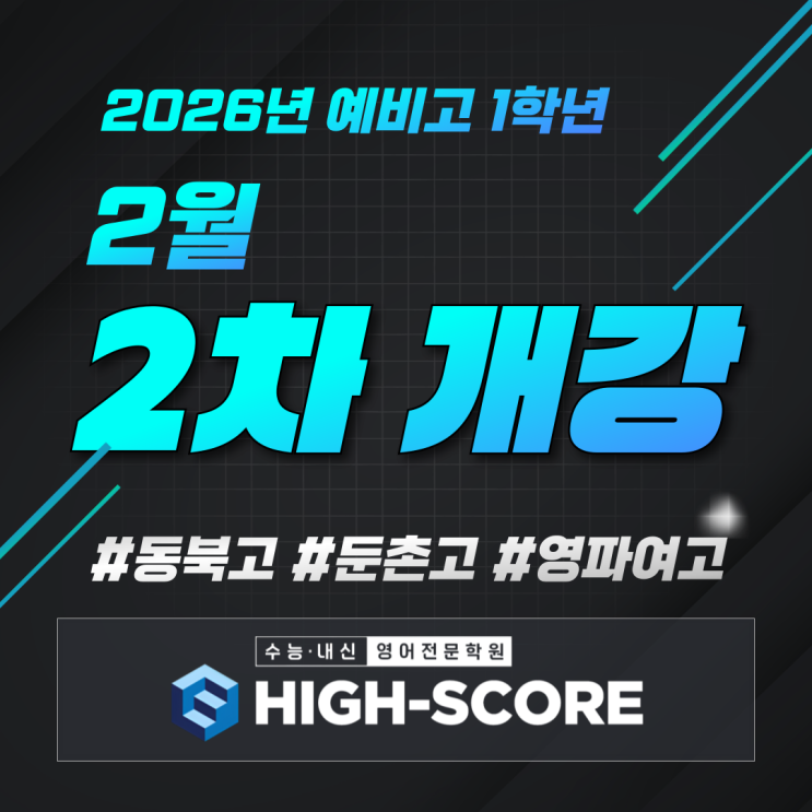 이제 학교 배정은 끝났고 우리 아이는 어디로 보내야 하지? 지난 1월 29일 고등하교 배정 결과가 발표 됐습니다. 학생 / 학부모님들께서 학원 선택에 심혈을 기울이고 계시리라 생각 됩니다. 하이스코어 영어학원에서는 동북고, 둔촌고, 영파여고 단 3학교만 내신 대비를 전문적으로 하고 있습니다. 별다른 홍보 없이도 감사하게도 많은 학부모님께서 입소문을 내주셔서 동북고, 둔촌고, 영파여고 학생들의 문의가 계속 되고 있습니다. <동북고 영어 시험 대비 모습> <영파여고 영어 시험 대비 모습> <둔촌고 영어 시험 대비 모습> 하이스코어 영어학원에서는 1월 커리큘럼이 종료되고 2월 커리큘럼이 시작됩니다. 2026년 예비....... <img src="https://blogthumb.pstatic.net/MjAyNjAyMDFfMjkx/MDAxNzY5OTUwNDIxOTI5.rBHBf-Nb4sj0fnkMocz3ge-pE3RavWmjRD79FONamjkg.dsxkpvZ-rmzm6S3sDomLzC2_xY2Pb2f5BU-W6iHk0D4g.PNG/001.png?type=s3" />