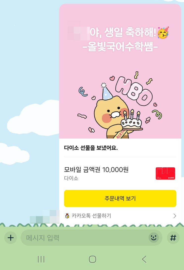 세상에 빛나지 않는 별은 없다! 안녕하세요. 진해 국어, 수학 학원 올빛국어수학입니다. 따뜻한 봄이 시작되는 3월, 생일을 맞이한 학생이 있어 축하 포스팅을 합니다. 덕산초 5학년 박OO 학생의 생일을 진심으로 축하합니다! 생일 선물로는 학생이 희망하는 다이소 모바일 금액권 을 선물했습니다. 올빛국어수학에서는 우리 학생들의 생일을 꼭! 챙기고 있는데요. 학원에서 맞이하는 첫 번째 생일에는 빛나는 별 50개, 두 번째~n 번째 생일에는 100개를 지급하고 있답니다. 우리 학생의 경우에는 학원에서 맞이하는 두 번째 생일이라 빛나는 별 100개가 즉시 지급되어 원하는 선물을 받게 되었어요! 이렇게 작은 관심과 선물이지만, 올빛국어수....... <img src="https://blogthumb.pstatic.net/MjAyNjAzMjNfMjA2/MDAxNzc0MjU2MTgwOTc1.RSZpVIeo_7kg8Dw07raaYdBb290i_p12H0c4qv8L59Ig.zmuukpl5OKix22w6ZRwnaTu0RokWv1J3EVNPkMWaMN8g.JPEG/Screenshot_20260323_174813_KakaoTalk.jpg?type=s3" />