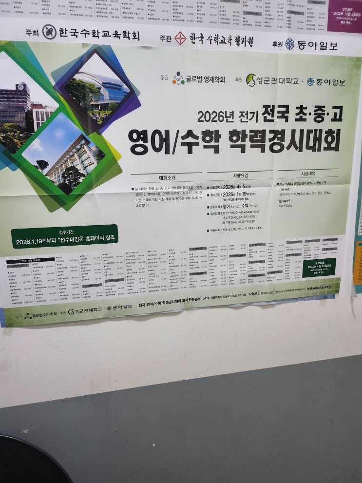2026년 전기 제51회 전국 영어·수학 학력경시대회 실시(성대 경시대회) 최상의 수업으로 보답하겠습니다! 문의전화 : 010-9300-0239 02 - 488-0239 2026년 제51회 전국 영어·수학 학력경시대회가 오는 4월 5일(일) 전국에서 일제히 치러진다. 성대 경시대회는 각 학교 최상위권 학생들이 학년별로 신청하여 참여하는 국내 최고 수준의 학력경시대회로 평가되는 대회입니다. 영어 또는 수학에 재능을 보유한 학생 누구나 응시 가능하며, 응시 학년은 초등학교 1학년부터 고등학교 3학년까지입니다 영어 응시 학년은 초등 3학년부터(초1,2도 응시 가능)이다. 전국 주요 시도별 지정 고사장에서 시험이 진행되며, 각 고사장 선택은 선착순으로 일부....... <img src="https://blogthumb.pstatic.net/MjAyNjAxMzBfMjg5/MDAxNzY5NzQ3ODA2NTgw.9YTnGxQOHnj70qurRc3VQGjfT5RpUwnlgWqhuBir83Ug.jl6icWAJJe9v7vdozfN6OnF2N2HWGt6RdYn-foXfTikg.JPEG/KakaoTalk_20260130_132241651_03.jpg?type=s3" />