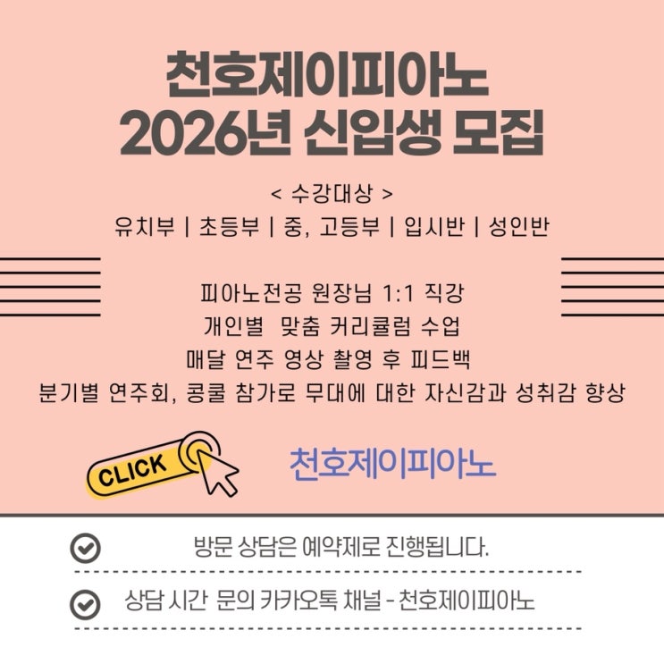 단순히 악보를 읽는 법을 넘어, 음악을 즐기고 표현하는 행복을 가르칩니다. 2026년 새 학기, 우리 아이에게 평생 곁에 둘 '음악 친구'를 선물해 주세요. 안녕하세요, 천호동에서 아이들의 음악적 감수성을 깨워주는 천호제이피아노입니다. 어느덧 2026년의 3월을 앞두고 있습니다. 우리 아이들에게 음악이라는 평생의 친구를 만들어주고 싶은 부모님들의 마음을 담아, 올해 신입생 모집 소식을 전해드려요. 왜 '천호제이피아노'여야 할까요? 1. 1:1 맞춤형 감성 레슨 아이들마다 손 모양도, 성격도, 음악을 받아들이는 속도도 다릅니다. 천호제이피아노는 아이 한 명 한 명의 눈높이에 맞춰 기초부터 탄탄하게, 그....... <img src="https://blogthumb.pstatic.net/MjAyNjAyMDJfMTcx/MDAxNzcwMDIwMjU1Njg3.XItLZzFjIvte1EQj6PqRUFd0-bs-rf7vjEjiyOkZPgAg.fKxXsiCS0kDPdSBdtv-V4rLYMoZm6AGUOclaePGvxIUg.JPEG/%C1%A6%B8%F1%C0%BB%A3%AD%C0%D4%B7%C2%C7%D8%C1%D6%BC%BC%BF%E4%A3%DF%A3%AD001%A3%A88%A3%A9.jpg?type=s3" />