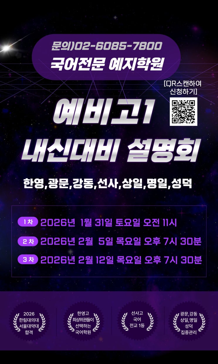 안녕하세요. 예지학원입니다~ 강동구 고덕역에 위치한 국어전문 예지학원에서 예비고1 학교별 내신 대비 설명회를 진행합니다. “ 26년 한림대 의대, 서울대 약대 합격 한영고 최상위권 학생들이 선택한 국어학원! (한영고1학년 학생 60명 이상 수강) 선사고 국어 전교 1등 광문고, 강동고, 상일여고, 성덕고, 명일여고 집중 관리 ” ------------------------------------------------------- 1. 일 시 : <1차>1월 31일 토요일 오전 11시 <2차>2월 5일 목요일 오후 7시 30분 <3차> 2월 12일 목요일 오후 7시 30분 2. 대상 : 예비고1 학부모님 및 학생 (한영, 강동, 광문, 선사, 상일, 명일, 성덕) 3. 장소 : 예지학원 3. 설명....... <img src="https://blogthumb.pstatic.net/MjAyNjAyMDJfNCAg/MDAxNzcwMDM3MDI1OTkx.wTsQ9yj1JfUASOPLpjQ-XUsq4njU0cFsI-dc_0OzARwg.qyKaqMdoTsLdG962HaSLO8E-uHG8tpMr6xGLEpCfqAAg.JPEG/%BF%B9%BA%F1%B0%ED1%BC%B3%B8%ED%C8%B8%283%C2%F7%29.jpg?type=s3" />