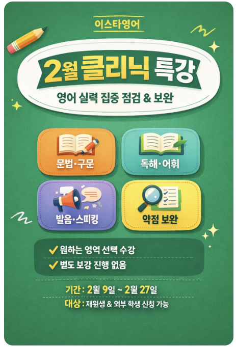 안녕하세요, 이스타영어학원입니다. 2월은 신학기를 앞두고 아이들의 영어 실력을 점검하고, 부족한 부분을 보완하는 중요한 시기입니다. 1월 방학특강을 마무리하고 2월에는 ‘클리닉 특강’과 신학기 준비 프로그램을 집중 운영합니다. 또한 신학기 초등영어수업 시 또한 수행평가 말하기 대비 발음을 점검하는 클리닉 실시합니다. 2월 클리닉 특강은 새로운 진도를 나가기보다, 지금까지 배운 내용을 정확히 점검하고 보완하는 수업입니다. **“어디가 부족한지 정확히 알고 새 학기를 시작하는 것”**이 목표입니다 특강은 아래와 같이 가능합니다. 영역별 선택 수강 가능 | 재원생 / 외부 학생 신청 가능 | 날짜별·횟수별 신청 가능 *신청은....... <img src="https://blogthumb.pstatic.net/MjAyNjAyMDJfMTU4/MDAxNzY5OTYyNzU5Njc2.r4Y2VQl3KwFzrXHjY2jx9Bf_D0am_uyEYNFvK-XXuDEg.U7Aks3eiiErlBl-eA30Fh_S9pSJdVBggOUHOWy4yx1Mg.PNG/KakaoTalk_20260202_011821633.png?type=s3" />