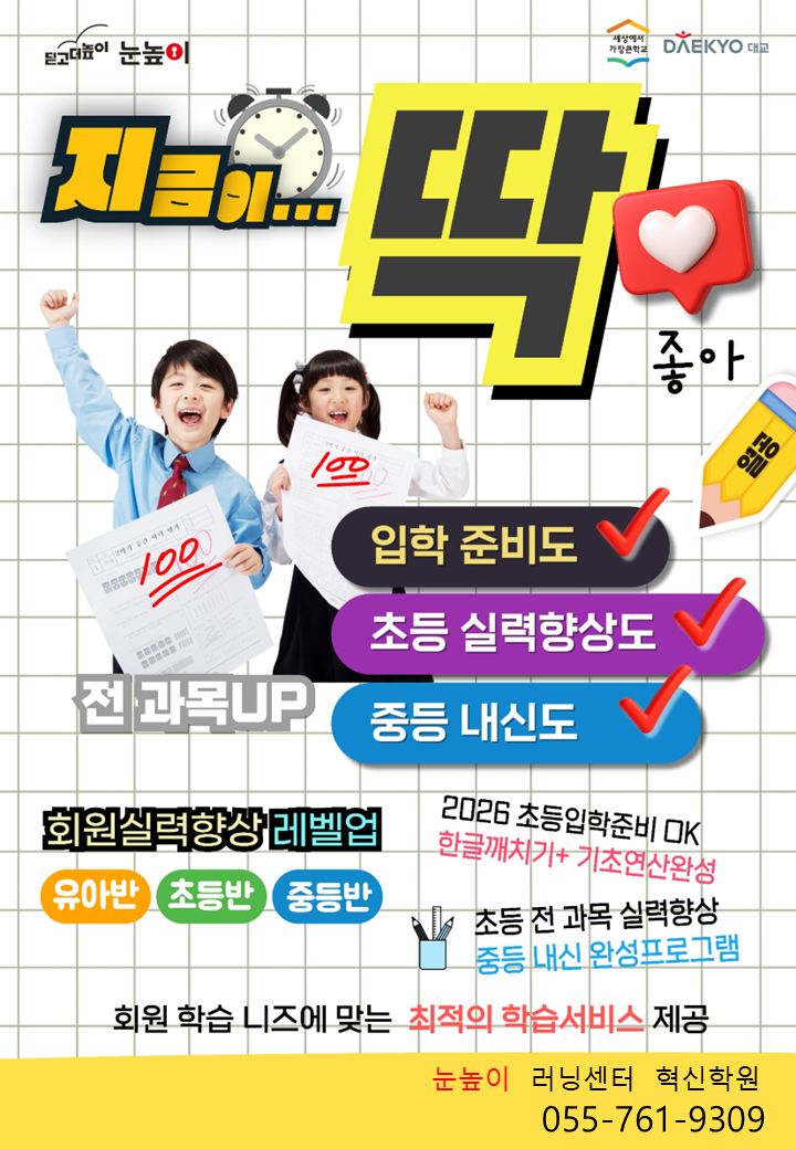 안녕하세요, 눈높이 진주 혁신러닝센터입니다. 겨울방학이 코앞으로 다가왔습니다. 학부모님들은 아마 이런 고민을 하고 계실 것 같아요. "방학 동안 우리 아이, 뭘 시켜야 할까?" "친구들은 다 학원 간다는데 우리 애만 놀려도 될까?" 사실 겨울방학은 생각보다 중요한 시기입니다. 방학 동안 아이들의 학습 격차는 생각보다 빠르게 벌어집니다. 한 학기 동안 쌓인 부족한 부분을 정리하지 않으면 새 학년에 올라가서 더 힘들어지고, 반대로 이 시기에 제대로 기초를 다지면 새 학기가 한결 수월해집니다. 특히 예비중학생이나 중학생 자녀를 둔 학부모님이라면 더욱 절실하게 느끼실 겁니다. 초등학교와 달리 중학교는 내....... <img src="https://blogthumb.pstatic.net/MjAyNjAyMDJfMTk2/MDAxNzcwMDIyNTE1NTYy.nK-apNWqB4gZkZNoc5NGdOrNmtUnKmenAmyPlW8dnE0g.Hy5mzCLis5d40wk3G7Fo1JA_1Nb1TdIBges_0F0ckFEg.PNG/%BD%BD%B6%F3%C0%CC%B5%E51.PNG?type=s3" />