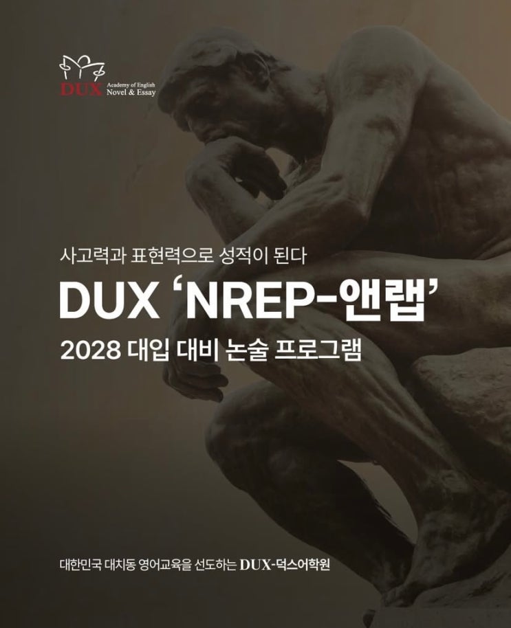 김해율하덕스어학원, 2월부터 시작되는 변화 ✨ 비문학 독해·영어논술 NREP 프로그램 도입! NREP은 비문학 제시문을 바탕으로 깊이 있는 사고력 + 논리적 표현력을 키우는 사고력 중심 영어 프로그램입니다. 대입 평가 방식이 빠르게 변화하고 있습니다. 이러한 흐름에 맞춰 덕스어학원 김해율하캠퍼스는 비문학 독해와 영어논술을 결합한 ‘NREP 프로그램’을 새롭게 도입합니다. 왜 NREP인가? 2028학년도 대입부터 사고력·논리적 표현력을 평가하는 정성평가 비중이 확대되면서 ✅ 제시문 이해력 ✅ 핵심 구조 파악 능력 ✅ 자신의 생각을 논리적으로 표현하는 힘 앞으로 이 모든 역량이 입시 경쟁력이 됩니다. "2028 대입 변화에 맞춘 비....... <img src="https://blogthumb.pstatic.net/MjAyNjAyMTFfOTgg/MDAxNzcwNzg0MTUyNTA0.AKr8vOqOhG2EBkbMW3dujJGhV9smHvIqudYHkBvi8N0g.Ffxs8NPp5nKdqlJmu-pSH4U1AC976eH5PJjFzkqJ2sYg.JPEG/KakaoTalk_20260211_132813643.jpg?type=s3" />