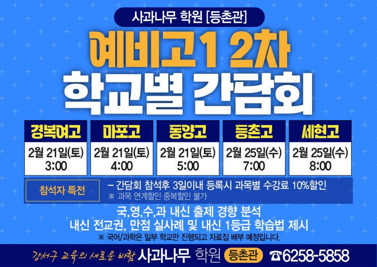 안녕하세요. 사과나무학원 등촌관입니다. 예비고1 내신 2차 간담회 – 사과나무학원 등촌관 1차 예비고1 내신 간담회가 많은 관심 속에 마무리되었습니다. 예상보다 빠르게 마감되었고, 추가 일정 문의가 이어져 2차 간담회를 준비하게 되었습니다. 고등학교 내신은 중학교와는 전혀 다른 구조로 운영됩니다. ✔ 시험 범위의 깊이 차이 ✔ 서술형·논술형 문항 증가 ✔ 수행평가 반영 비율 ✔ 한 문제 차이로 갈리는 등급 구조 특히 1학년 1학기 첫 시험은 이후 학교생활의 방향을 결정하는 매우 중요한 시험입니다. 학교별 내신, 왜 전략이 필요할까요? 경복고 · 마포고 · 동양고 · 등촌고 · 세현고 등 학교마다 출제 방식과 난이도는 분....... <img src="https://blogthumb.pstatic.net/MjAyNjAyMTVfMjM3/MDAxNzcxMTMyNTc0MjI3.JYYbMGVnfLFLvNqoA4lL_OYm8CT-jAVQeLjPzTPdsAog.x4CHvxrw1aJS92SnGcPsX08n07EdD_MfEVHNl6CHW7Ug.JPEG/2.10-%BF%B9%BA%F1%B0%ED1_2%C2%F7_%B3%BB%BD%C5%B0%A3%B4%E3%C8%B8-A4-01.jpg?type=s3" />