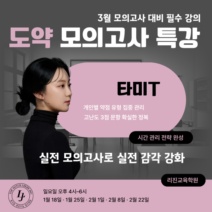 학생들이 실전 감각을 끌어올릴 수 있도록 ‘영어 도약 모의고사 특강’이 진행중에 있습니다 ✨ 타미T의 영어 도약 모의고사 특강 안녕하세요? 프리미엄 리진교육학원입니다. 3월 모의고사가 다가오고 있어요 이번 시험은 단순한 점수 확인이 아니라, 지금까지의 공부 방향을 점검하고 다음 단계로 도약하는 기회가 되죠. 그래서 리진교육학원에서는 학생들이 실전 감각을 끌어올릴 수 있도록 영어 도약 모의고사 특강이 진행중에 있습니다 ✨ 타미T의 영어 도약 모의고사 특강 ✨ 실전 감각 강화 & 시간 관리 전략 완성 일요일 오후 4시~6시 1월 25일 · 2월 1일 · 2월 8일 · 2월 22일 타미T의 특강은 단순한 문제풀이....... <img src="https://blogthumb.pstatic.net/MjAyNjAxMjZfMjcy/MDAxNzY5NDI4MjI4MDg3.YUz1eakZVVGvpkSkllnjK8DLYmerqKyKIuvTS6v3Kf8g.0GmUhZeqmlo66xb9dpxR1RvFDeoFKfOG8GaX2QiLGogg.PNG/%B5%B5%BE%E0.png?type=s3" />