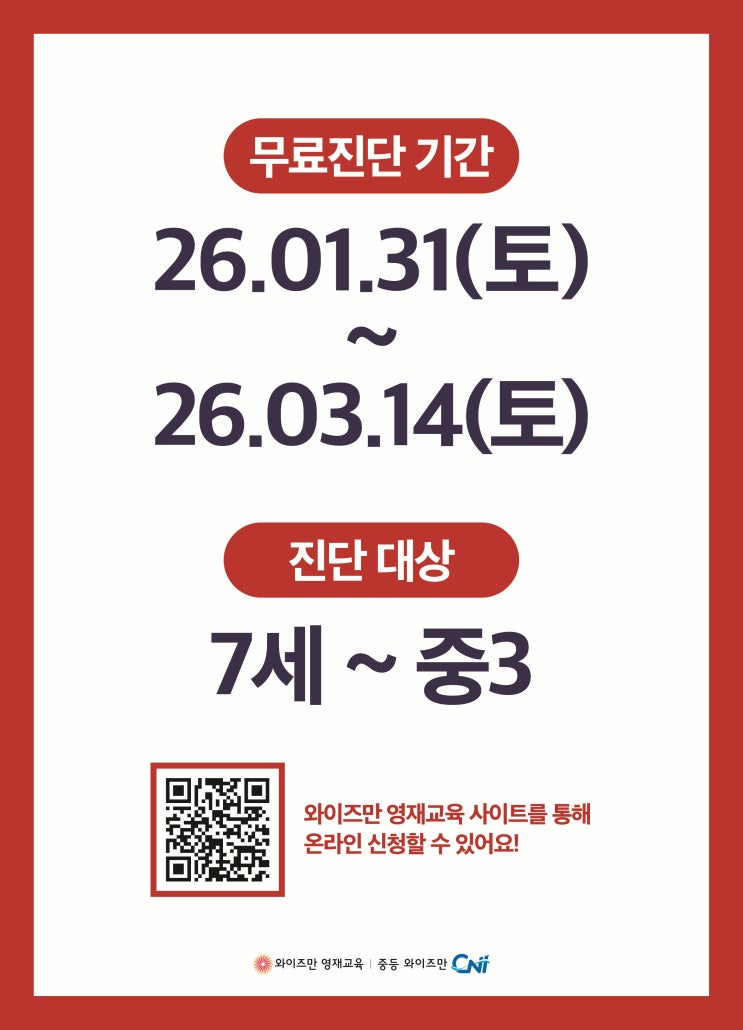 안녕하세요~^^ 즐거움, 깨달음, 감동이 있는 창의 사고력 교육 와이즈만 거제 센터입니다 2월이 시작되었습니다 와이즈만 본사에서는 신학기 무료 진단 검사를 시행합니다 물론~ 거제점도 무료진단 가능합니다 무료진단 기간은 1월 31일 토요일~3월 14일 토요일 가지입니다 날짜를 확인하시어 큐알 코드를 통해 예약 주시거나 055-635-0358 학원으로 예약 주셔도 가능합니다 남은 오후 시간도 잘 마무리하세요 <img src="https://blogthumb.pstatic.net/MjAyNjAyMDNfMTc3/MDAxNzcwMTA0NjY1NjA1.rqu9g0swVyFZdWbtMp1yPPREo-XN-VRHVaX1ZuEXdOQg.hqnZQBNrQKVQgB02D5OSnuImrjf7SVr7rvE79wgeksYg.JPEG/2026_%BD%C5%C7%D0%B1%E2_%B9%AB%B7%E1%C1%F8%B4%DC_%C6%F7%BD%BA%C5%CD.jpg?type=s3" />