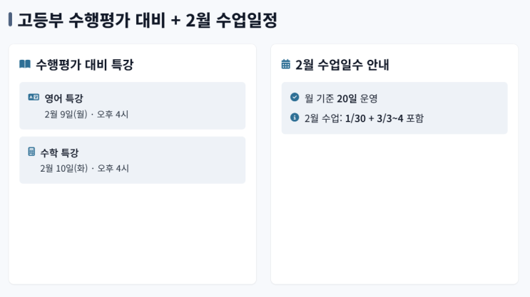 안녕하세요. 새해의 설렘이 채 가시기도 전에 어느덧 2월을 맞이했습니다. 차가운 바람 속에서도 햇살은 조금씩 길어가는, 봄의 기운이 느껴집니다. 1월 학습에 몰입해 준 아이들과 과정을 믿고 기다려 주신 학부모님들께 정말 감사합니다. 아이들의 성장을 위해 애쓰신 선생님들께도 깊은 고마움을 전합니다. 특히 2월은 매우 중요한 시기입니다. 이 시기에 얼마나 부지런히 준비하느냐에 따라 학기 중의 방향과 밀도가 달라집니다. 저희는 늘 이 시기를 부지런히 봄을 준비하는 농부의 마음으로 바라봅니다. 눈에 보이는 변화보다 뿌리를 단단히 내리는 시간이기 때문입니다. 공부의철인 수학의힘은 이 시기에 더욱 집중합니다. 결과보다 과정....... <img src="https://blogthumb.pstatic.net/MjAyNjAyMDFfMTI2/MDAxNzY5OTQyNTg5NTI1.NgckfwBg0QIOfvz40pEIKAgGWfjxNuGmWea6KfSDHa4g.909CoPOYEY24FrG46dM8VHY96Y3nigCYabzjZgCikrQg.PNG/%BD%BA%C5%A9%B8%B0%BC%A6_2026-02-01_193917.png?type=s3" />