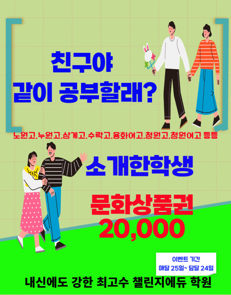 최고로 가르치겠습니다. #친구소개 #마들역학원 #최고수챌린지에듀 #최고수수학학원 #챌린지에듀학원 #고등수학 #고등영어 #고등국어 #고등과학 #청원고 #청원여고 #노원고 #수락고 #용화여고 #누원고 #상계고 #내신#수능 #모의고사 #중간고사 #기말고사 #입시진학 #마들역 #고3 #고2 #고1 #9년연속 #스카이합격 #의대합격 #치대합격 #약대합격 #한의대합격 #서울대합격 #고려대합격 #연세대합격 <img src="https://blogthumb.pstatic.net/MjAyNjAyMDNfMTUx/MDAxNzcwMTA3NDM0NDkz.5af9jXzqHISfKXyHhV5K7e9jTCUOrXRLtoiTJTM0Fgwg.oDc7DJhlHHShuxj8KBAAD21VBn-3pHifbReM_lA6LmIg.PNG/26-2%BF%F9%C4%A3%B1%B8%BC%D2%B0%B3.png?type=s3" />
