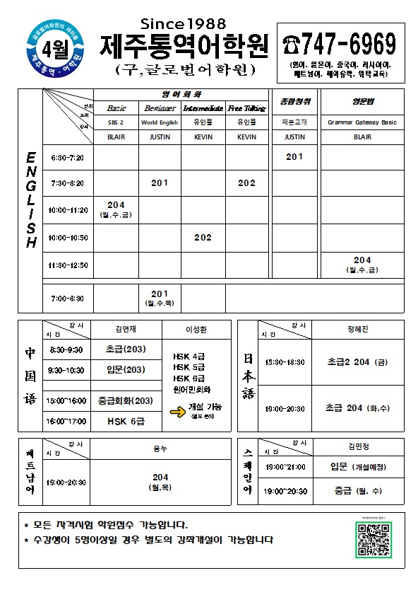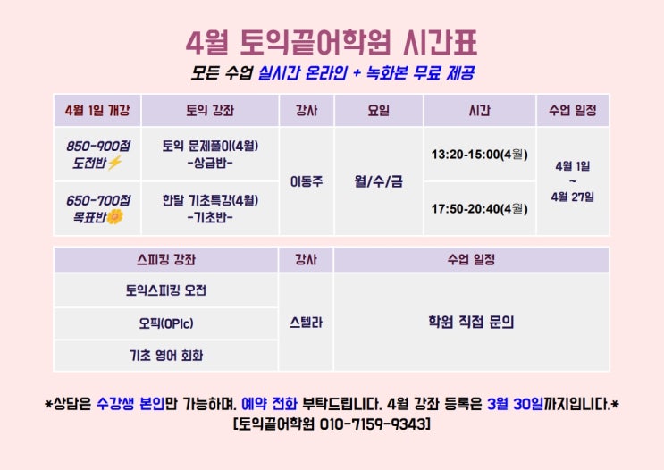 안녕하세요! #토익끝어학원 입니다. 어느새 4월이 코앞으로 다가왔어요. "토익, 이번엔 진짜 시작해야 하는데..." 싶으신 분들 주목! 토익끝어학원이 4월 강의 시간표를 준비했습니다. 일단 등록하면 반은 한 거예요! ── 4월 시간표 ── ▪ 한달 기초특강 - 기초반 ▪ 토익 문제풀이 - 상급반 ▪ 토익스피킹 & 오픽 & 회화 (개별 문의) * 상담은 수강생 본인만 가능하며, 예약 전화 부탁드립니다. * 강좌 등록은 3월 30일까지입니다. 상담 가능 시간 : 월 · 수 · 금 오전 9시 ~ 오후 4시 상담은 전화 예약 후 방문 부탁드립니다. 전화 : 010-7159-9343 카카오톡 : toeicend 주소 : 제주대학로 117, 2층 <img src="https://blogthumb.pstatic.net/MjAyNjAzMjBfNzcg/MDAxNzczOTkxNTEzMzQ3.sgJz4nFxyuure5KIT-Grl8mXWjKpGIdkPXcx8_I1QdUg._QEcIy6x7V8P38InpIwy4sBjOOFO2dOKGf1wdyz_pD0g.JPEG/26%B3%E2_4%BF%F9_-_3%BF%F9_25%C0%CF_%C0%CC%C0%FC_%B0%D4%BD%C3%BF%EB_1.jpg?type=s3" />