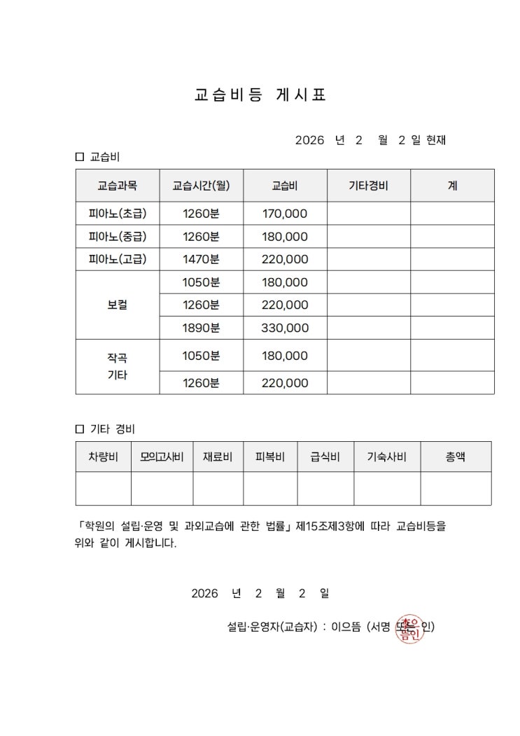 레츠실용음악학원 교습비