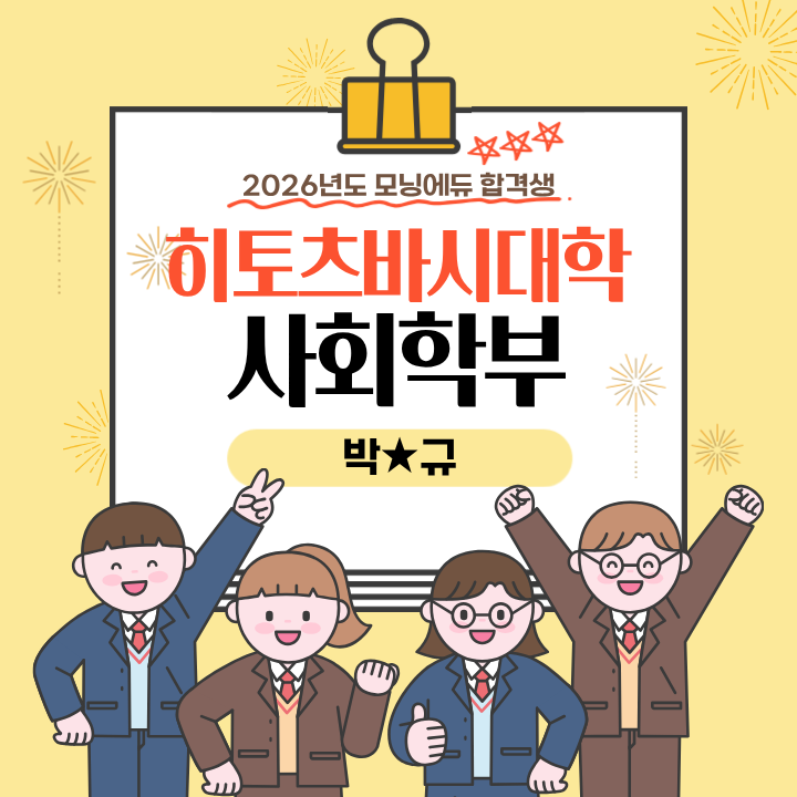 안녕하세요, 정확한 티칭으로 목표 대학을 높이는 모닝에듀입니다. 오늘은 히토츠바시대학 사회학부에 합격한 박O규 학생의 후기를 소개해 드리려고 합니다. 일본 여행을 계기로 유학을 결심한 시작부터, EJU를 6월에 마무리하고 본고사 준비를 어떻게 했는지까지 입시 전반의 이야기가 담겨 있는 후기입니다. 수업을 통해서 받은 도움들이 세세하게 나와있어서 이 부분이 본고사를 준비할 수험생분들께 도움이 되리라 생각합니다. 박O규 학생의 합격을 진심으로 축하드리며, 건강히 군 생활을 마친 후에 멋진 대학생으로 만날 날을 기다리고 있겠습니다! 안녕하십니까. 히토츠바시대학 사회학부에 입학하게 된 박O규라고 합니다. 제 경험 및 합....... <img src="https://blogthumb.pstatic.net/MjAyNjA0MDRfMTM3/MDAxNzc1Mjg2MTA3NzE3.5mrMcPoBs31O_fqrFTaVhthw2h9cG-MxbM_bAO8y36Ig.wvoU3s8KcWqA0n3pw_5aJONrQ4CKnYV2bnwsOhMwz4Ig.PNG/2025_%285%29.png?type=s3" />
