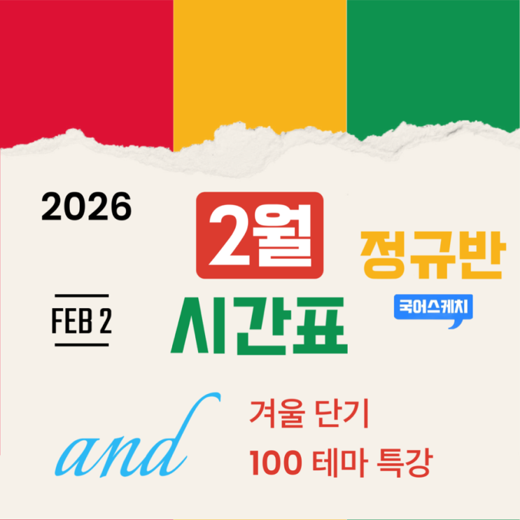 2월 시간표 [2026년 국어스케치 핵심가치] 너의 의지로 움직여야 할 시간, 지금! 안녕하세요. 국어스케치입니다. 2026 정규반 2월 시간표와 겨울 단기 테마 100특강을 공개합니다. [2026년 학년별 2월 정규반 시간표] 반 이동 및 수업 첫 참여 시 학원으로 꼭 연락주십시오. 2월 1일(일)부터~! 요일별로 순차적 개강 {중등부 : 중등내신 + 고등국어 선행 그룹} 앨리스 + 루시 •예비중1 -월요일 오후 4시30분 앨리스 -목요일 오후 4시30분 앨리스 •예비중2 -토 오후 6시 앨리스 -월 오후 5시 -화 오후 5시 앨리스 -금 오후 5시 앨리스 •예비중3 -토 오전 11시 -토 오후 6시 -일 오후 5시 -월 오후 5시 -화 오후 5시 앨리스 -금 오후 5시 앨리스....... <img src="https://blogthumb.pstatic.net/MjAyNjAxMzBfMjA3/MDAxNzY5NzEyNTg4NjEz.QzNsikUiusHrb8XLyxBV_MQNiRXq1Ku_MlXc0qZnY7Ig.VV60SKr3ov1aDkhThrK8BFxGl6zJyIYSkg23RKBYyKIg.PNG/Bazaart%A3%DF14C3ED74%A3%AD95D4%A3%AD4978%A3%AD8E56%A3%AD49E48E12507B.png?type=s3" />