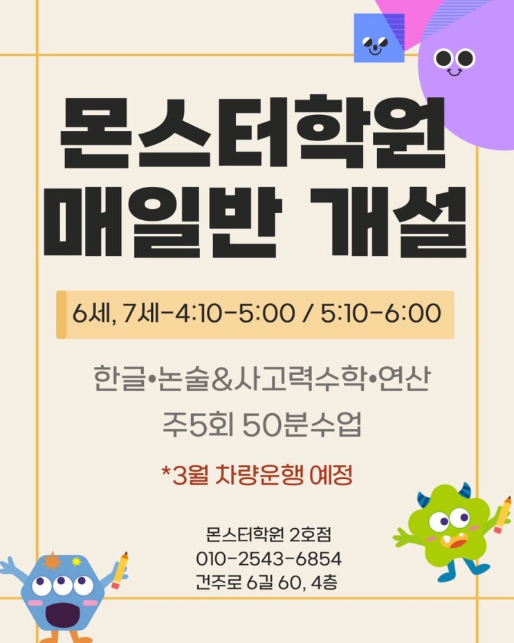삼화지구 유치부 매일반 신입생 모집 안내 *3월 차량운행 예정! 아이의 첫 학습 경험은 평생의 공부 태도를 결정짓는 중요한 시작점입니다. 삼화지구 유치부 매일반은 유아의 발달 단계에 맞춘 체계적인 커리큘럼으로, 한글과 수학의 기초를 탄탄히 다지는 것은 물론 사고력과 표현력, 독서 습관까지 함께 키워주는 프로그램입니다. 매일 등원하여 규칙적인 학습 리듬을 형성하고, 놀이와 학습이 조화롭게 어우러진 수업을 통해 아이가 즐겁게 배우며 성장할 수 있도록 지도합니다. 유치부 시기는 언어 발달과 사고력이 급격히 성장하는 시기입니다. 이 시기에 아이가 글자와 숫자를 억지로 외우기보다는, 원리를 이해하고 스스로 생각하는 경험....... <img src="https://blogthumb.pstatic.net/MjAyNjAyMDNfODgg/MDAxNzcwMDcyOTAyOTY0.E9CE1wz-BtNNhq3aWzeM4vK468E_g3kaAEeVZ1wZ89Ug.riS7Lf6WVkTeRflffJr8GSQ_iPIAypJV88Ja05DjyZQg.JPEG/%C1%A6%B8%F1%C0%BB%A3%AD%C0%D4%B7%C2%C7%D8%C1%D6%BC%BC%BF%E4%A3%DF%A3%DF%A3%AD%BA%B9%BB%E7%BA%BB%A3%AD001.jpg?type=s3" />