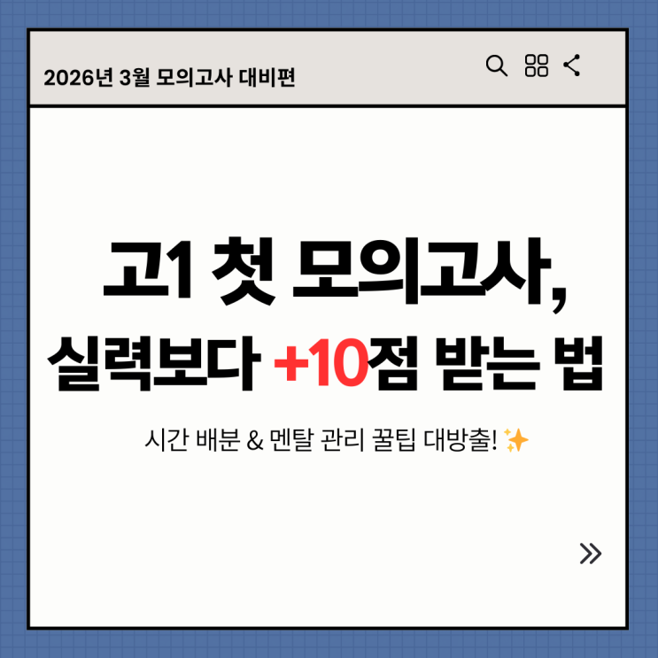 안녕하세요! 학생들의 꿈을 현실로 만드는 무한도전 수학학원입니다. 설레는 고등학교 입학이 코앞으로 다가왔네요. 우리 예비 고1 학생들, 교복 맞추고 입학 준비하느라 바쁠 텐데요. 하지만 마음 한구석에는 곧 치르게 될 고1 3월 모의고사 때문에 걱정이 많을 거예요. "중학교 시험이랑 많이 다르다던데..." "범위는 어디고, 준비는 어떻게 하지?" 걱정 마세요! 오늘 무한도전 수학학원이 여러분의 불안감을 없애드리고, 실력보다 딱 10점 더 받을 수 있는 고1 3월 모의고사 실전 꿀팁을 정리해 드릴게요. 특히 가장 중요한 모의고사 시간 배분 전략과 중등 수학 총정리 포인트까지 확실히 알려드립니다! 고1 3월 모....... <img src="https://blogthumb.pstatic.net/MjAyNjAyMDRfMTEg/MDAxNzcwMTg4MTEwMDky.dxwhF_vH0E_7rM0Wtiuygho81QD3D3sx4UNVtlz-_8Qg.naz37JWNb7QU38WbkBavUHHdFz6O689gs90FQnVJcLIg.PNG/1.png?type=s3" />