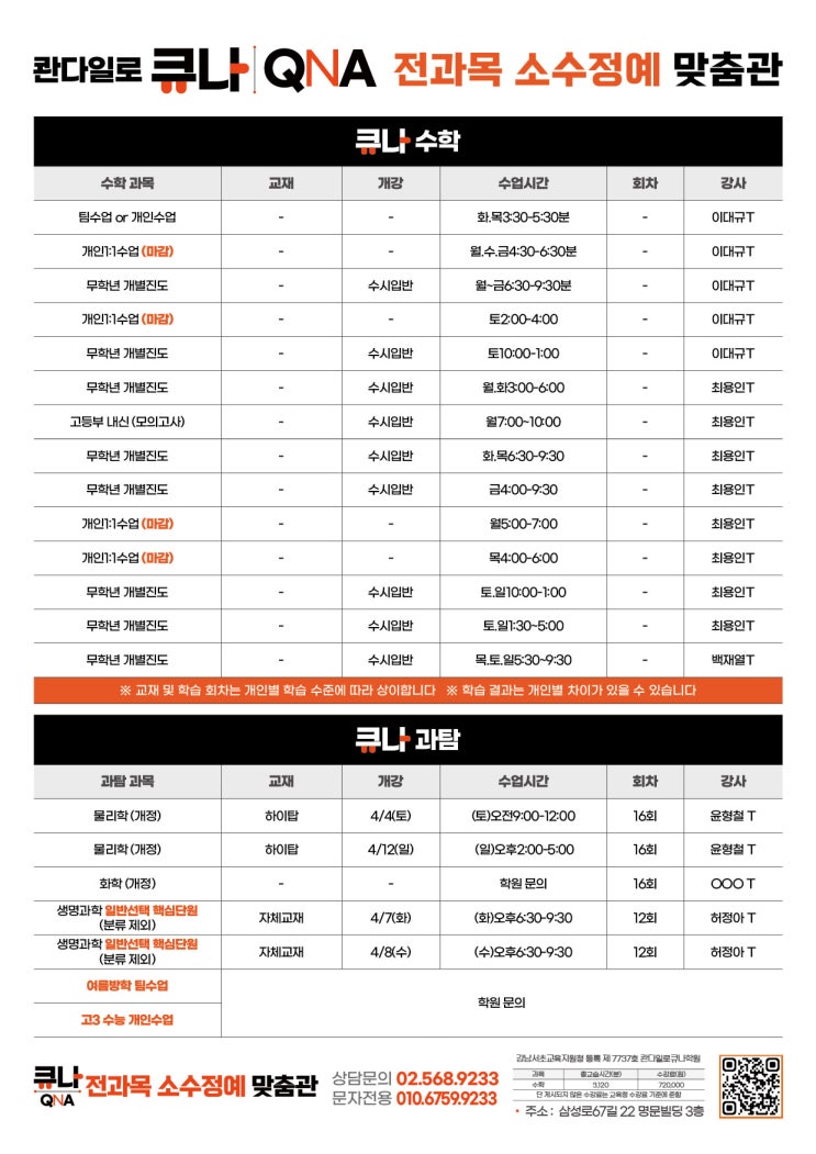 콴다일로 큐나 전과목 소수정예 맞춤관 시간표