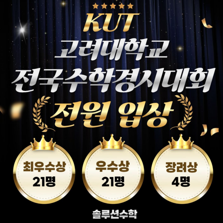 안녕하세요~~! 부산 전포동 송상현 광장 앞에 위치한 솔루션수학 입니다! 이번 고려대학교 전국수학경시대회(KUT) 에서 ✨✨ 참가 학생 전원 입상 ✨✨이라는 정말 값지고 의미 있는 성과를 이루었습니다! 수상 결과 안내 최우수상 21명 우수상 21명 장려상 4명 " 총 46명 전원 입상 " 이라는 결과는 단순한 문제 풀이를 넘어 ✔️ 탄탄한 개념 이해 ✔️ 실력을 키우는 사고력 중심 수업 ✔️ 스스로 해결하는 힘 이 모두 갖춰졌다는 증거라고 생각합니다 아이들이 어려운 문제 앞에서도 포기하지 않고 끝까지 도전할 수 있었던 이유, 그 해답이 바로 솔루션수학의 수업에 있습니다 ☎️....... <img src="https://blogthumb.pstatic.net/MjAyNjAxMTRfMjY1/MDAxNzY4MzY2MzE4ODQ0.DIMpHq663IaJtlNHg8-2ieopkZ_aMhA898h2k23zOCcg.rxRTrd1Ne2_gdFIje5NQpD17ag6HfC2Hr5ZhdPokbTkg.PNG/image.png?type=s3" />