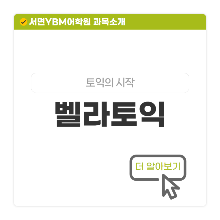 안녕하세요! 서면YBM입니다 오늘은 토익의 시작을 앞두고 있는 여러분을 위한 강좌 벨라토익 수업에 대해 알아보아요! 초단기 한달 프로젝트 전문 필요한 것만 제대로 공부하자! 벨라토익 단기간 토익 강좌를 찾거나 진짜 토익 공부가 하고싶으시다면? 이번 겨울방학 벨라토익 수업으로 토익 졸업하자! 650+ 토익시작반 수능 3~5등급, 토익 500점 이하 대상 기초부터 차근차근 배우는 반 *토린이, 토익 초보, 토익 공부를 제대로 해보지 않은 사람 등록! 750+ 토익 문풀반 수능 3등급 이상, 토익 500점 이상 대상 문제풀이 스킬과 수업 전 스터디로 단기간 점수 확실하게 받기! 750+ 실전속성반 토익시작반+토익문풀반이 합쳐진 코스 토익의 A부....... <img src="https://blogthumb.pstatic.net/MjAyNjAxMTlfMzcg/MDAxNzY4NzkxOTY0MTEy.p2kEMHxjCndIwm-cPGInuAsFuDGY2lTRCKj0Opv8Nh8g.Ut1HLIgK7pt5vQUvrb9hN6KmC861_LA9FBFqhfWlwlUg.PNG/%BA%ED%B7%CE%B1%D7_%B0%FA%B8%F1%BC%D2%B0%B3.png?type=s3" />