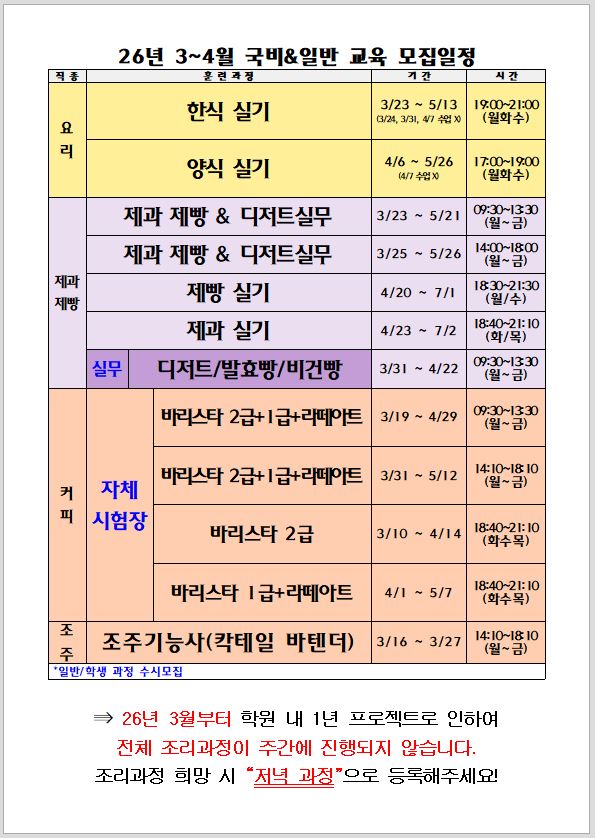 ♥️26년 2~4월 국비&일반 모집 일정이 업데이트 되었어요!!!♥️ 궁금하신 과정 있으시면 아래 번호로 전화 주세요~~ 친절하게 상담 도와드리겠습니다:) ☎️ 051-333-2215 * 26년 3월부터 학원 내 일반고 고교위탁과정 진행으로 조리과정이 오전,오후에 진행 되지 않습니다. 조리과정 희망 시 "저녁과정"으로 등록해주세요! 오시는 길 : 덕천역 2번출구 다이소 7층건물 한국제일요리커피학원 <img src="https://blogthumb.pstatic.net/MjAyNjAzMDVfMjc3/MDAxNzcyNjc4Njc4MDIy.tJdwTVmswlrUvyB3g9mDfkuOHwRW8SmeQau-0ZBCEc0g.mpQYukXdMtEWaHlVzFEPOWNEknMGm45ln0jjNKTCUpUg.JPEG/%B8%F0%C1%FD%C0%CF%C1%A4.JPG?type=s3" />