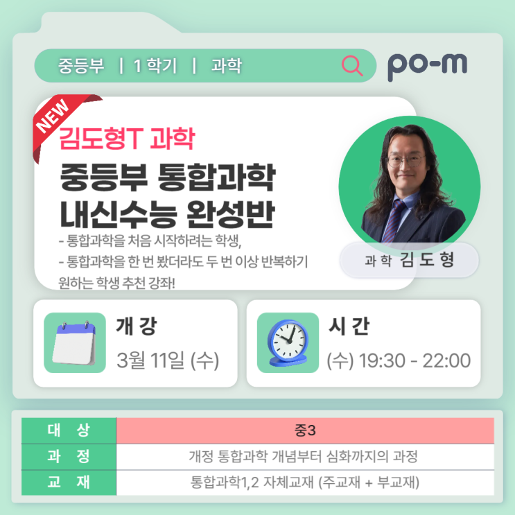 거품은 싹 빼고 밀도는 높인다! 고등선행 15명 선발 "100분을 앉아있다고 100분 공부한 게 아닙니다." 멍하니 칠판만 바라보는 20%의 집중력으로는 고등 성적, 절대 바뀌지 않습니다. 그래서 포엠이 준비했습니다. 압축 강의 X 독한 관리 = 마이크로러닝 1️⃣ 압축 클립형 동영상 강의 지루할 틈이 없습니다. 핵심만 꽉 채운 압축 클립으로 몰입도를 극대화합니다. 2️⃣ 메타인지 필기 시스템 "눈으로만 보는 건 공부가 아닙니다." 매 클립 시청 후 [핵심 요약 + 이해도 체크]를 적지 않으면 다음 진도로 못 넘어갑니다. 3️⃣ 빈틈없는 블록형 관리 타 학원 숙제하느라 시간 낭비? NO 나만의 [고정 시간표]를 설계하.......
