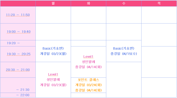 방문 상담X / 전화 상담O - 월요일~수요일 PM 4:00 ~ 7:00 가능. *목금토일 휴무 <필독> 등록 전에 반드시 본원 블로그 게시글(최소한 공지 글이라도)을 꼼꼼히 읽고, 발레의 본질을 이해한 뒤 등록해 주시기 바랍니다. 블로그 글을 많이 읽고 오셨다는 분들은 클래스에 임하는 태도부터 확연히 다르며, 그에 따른 피드백의 결과 또한 탁월합니다. 부디 발레가 무엇인지, 그리고 어떤 마음가짐과 자세로 임해야 하는지 만큼은 꼭 숙지하신 후 등록해 주시기 바랍니다. 태도가 모든 것을 결정합니다. Attitude is everything! ★ 04월 취미 발레 클래스 수강신청 기간! 등록 마감일 03/17(화)까지 ★ ※ 먼저 아래 "클래스 스케줄....... <img src="https://blogthumb.pstatic.net/MjAyNjAzMDRfMTAy/MDAxNzcyNjEzNTk0MjM0.Bkl6uOCYn1OSQDa4R236OaawgwVHIHBh4ZoXAdneeyAg.9v0fReR-AsUCR2dz-LoUQbe22DJFndz0XTn8IjNm5Tog.PNG/4%BF%F9_%BD%C3%B0%A3%C7%A5.png?type=s3" />