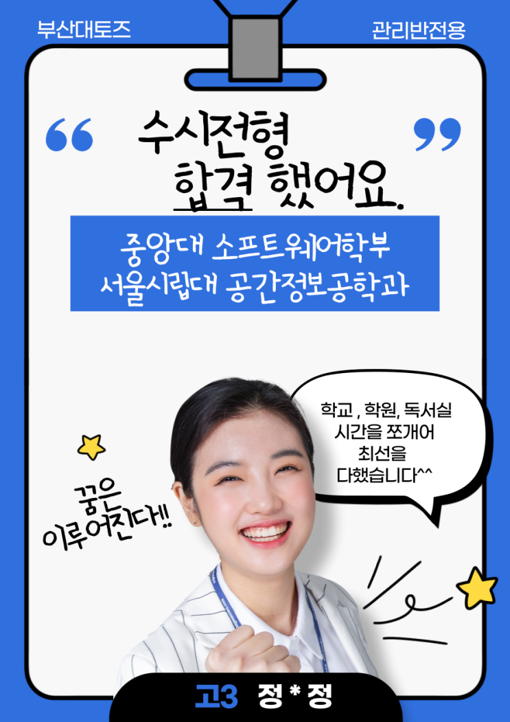 오늘은 수시 합격 2탄입니다~~ 물론 부산대와 국립대 합격생들이 있지만, 인 서울 위주로 올리게 되네요ㅎㅎ 지난번 수시 합격 1에서 소개한 학생의 친구이기도 하고 같은 반이라고 이번에 알게 되었어요. 몇 달간 공부하러 왔어도 이야기하는 모습을 보지 못해 친한 친구 사이인지 모르고 있었답니다. 심지어 친한 친구들이 몇 명이나 더 있었는데 관리반 매니저 쌤들이 모르고 있었다는 것은 관리반 독서실에서 친구들이 이야기하는 모습을 본 적 없었기 때문입니다. 그런데 지지난 주 합격한 친구 4명이 함께 시간 맞춰 와서 소식을 전해주어 친한 친구, 같은 반이라는 것을 알게 되었어요. 학교 마치고 학원 일정도 있지만, 관리반에서 공부....... <img src="https://blogthumb.pstatic.net/MjAyNjAxMTJfMjAw/MDAxNzY4MTgzNjkyNzU5.M1Swr6XYBCaVTQSsKz3h7LSife_VKTV1fKDY7EK3Z9Ig.Tk2vzkPwAn_FkZhMm74lxqzL1qDpu0uxQi2JKq5ZFcgg.PNG/001.png?type=s3" />