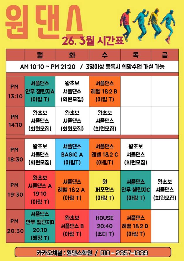 2026. 3월 시간표 <원댄스학원> 원댄스학원은 셔플전문댄스학원 입니다. <원댄스학원 26년 3월 시간표 안내> 1) 왕초보 셔플댄스 - (2개월 과정) - 오후 월요일 19:10 ~ 20:00 (1개월차) 26.3.9 개강 - 오후 화요일 20:10 ~ 21:00 (1개월차) 26.3.3 개강 2) 셔플댄스 레벨1 & 2 - (각 3개월 과정) - 오후 화요일 19:10 ~ 20:00 (레벨2 1개월차) 26.3.3 개강 - 오후 수요일 13:10 ~ 14:00 (레벨1 1개월차) 26.3.4 개강 - 오후 목요일 20:10 ~ 21:00 (레벨1 1개월차) 26.3.5 개강 3) 원 퍼포먼스 - (공연반) - 오후 수요일 19:30 ~ 20:30 (매달) 26.3.4 개강 = 셔플댄스 레벨 2이상(공연 및 대회 준비반) 4) 셔플댄스 안무 챌....... <img src="https://blogthumb.pstatic.net/MjAyNjAzMDNfMTYw/MDAxNzcyNDY4MDAwMzI1.6HIrtr-6SE7s-bNs2Q8wxACDS3GidVcZAxqFyMXvDVsg.qMnRsBpdEiGqvdLBQk7eFnhzZO0cLPDjRMV80o8zum4g.PNG/3%BF%F9.PNG?type=s3" />