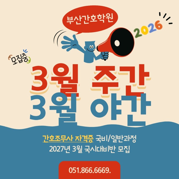 안녕하세요 부산간호학원 글쓰니입니다. 2026년 새해가 밝았습니다~ 새해복많이 받으세요~ 새해 2026년 올해 첫 개강반 소식을 전해드립니다~ 그동안 12월 속성반 개강과 3월 국시대비로 학원은 바쁜 나날을 보내고 있습니다~ 많은분들이 부산간호학원을 선택해주셔서 너무 감사해요~ 2026년 새해에도 선택에 보답하고자 훈련생 여러분들의 국시합격까지 최선을 다해 써포트하는 부산간호학원이 되겠습니다~ 이번 3월 모집반은 2027년 3월 국시대비반으로 3월 정규반 주간, 야간반입니다. 주간반은 3월 23일 야간반은 3월 10일 개강반으로 모집중에 있습니다~ 주간반 3월 23일 개강 야간반 3월 10일 개강 주간반은 약 11개월 야간반은 12월과정으....... <img src="https://blogthumb.pstatic.net/MjAyNjAxMTlfNCAg/MDAxNzY4ODA2MzgwOTU2.mDOY_ih9GRaIUDm0TDyohB7g9Xn7A-IKil3nB9vqmigg.AkQzzrEEb-EZJp8eY0-6L5AQkMiSsm7ZJcf-xHh2UVEg.JPEG/3%BF%F9%C1%D6%BE%DF%B0%A3.jpg?type=s3" />
