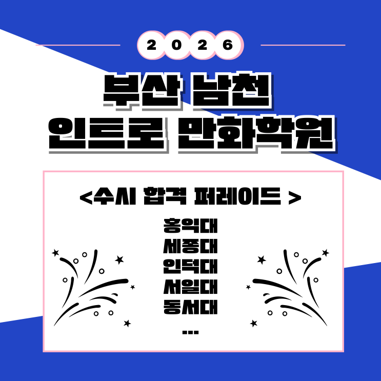2026 수시 합격 부산 남천 인트로 만화학원 꿈을 현실로! 해운대 광안리 만화학원 안녕하세요!! 남천 인트로 만화학원입니다~ 오늘은 많은분이 기다리셨던 기쁜 소식, 바로 2026 수시 합격 퍼레이드 소식을 전해드리려고합니다! 올해도 어김없이 우리 남천 인트로 만화학원의 학생들의 노력이 빛을 발하며 주요대학 합격 소식이 이어지고있는데요. 특히 학생들의 관심이 높은 홍익대 인서울 대학을 비롯해 주요 만화.애니메이션 학과 합격 비결을 공개합니다. 해운대 광안리 만화학원 남천 인트로 만화학원의 합격 공식! 매년 놀라운 합격 퍼레이드를 이어가고 있는데요~ 매년 이렇게 좋은 결과를 낼 수 있는 이유는 무얼까요? 1. 철저한 데이터....... <img src="https://blogthumb.pstatic.net/MjAyNTEyMThfMjE1/MDAxNzY2MDQ1MzA5NTA0.wAdJpRShz2zkZUvFfXOM-kPIF2fuVmC_LmMWBiUqX3cg.yzcCoJtHRKZR8ZRfLQsHGLT9_qakzHyT0PD5zEyxalMg.PNG/%C0%CE%C6%AE%B7%CE_%BC%F6%BD%C3%C7%D5%B0%DD_%BD%E6%B3%DA.png?type=s3" />