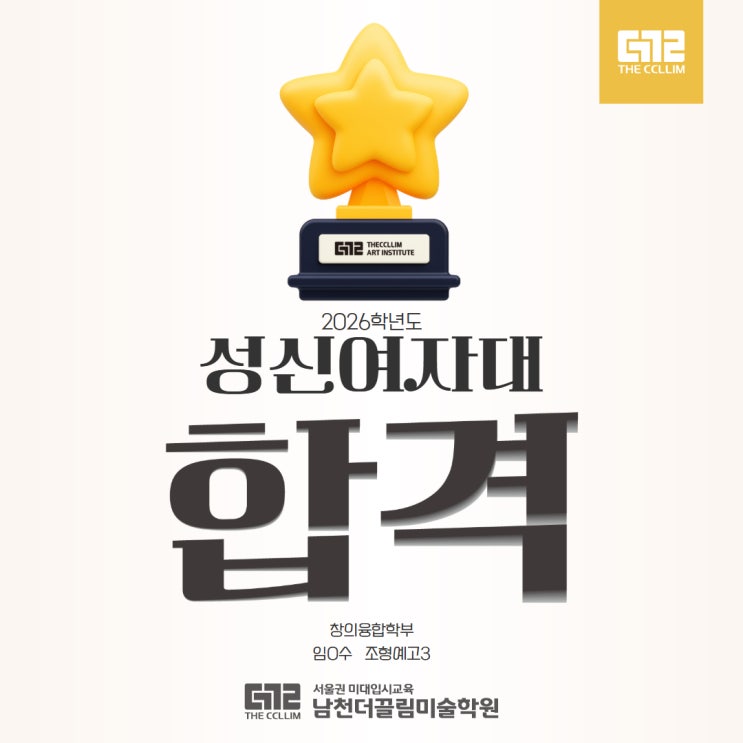 #부산미대입시학원#부산수영구미술학원#부산광안리미술학원#부산미대입시#남구미대입시 #남구입시미술학원 #남천입시미술#남천미술학원#원장님특강#실전처럼#꼼꼼하게#기초디자인#부산금련산미술학원#부산미대입시준비#부산미대#남구기초디자인학원#소수정예수업#부산입시미술컨설팅 #부산미술학원 원장님 직강 + 소수정예 + 서울강남 교육시스템 이 모든 것을 한 곳에서! 남천 더끌림 미술학원 안녕하세요~ 남천 더끌림 미술학원 입니다. 이제 슬슬 결과가 발표나고 있는데요? 2026학년도 남천 더끌림 미술학원 성신여자대학교 합격!!! 이라는 놀라운 결과를 소개해드립니다. 소수정예수업 + 원장님 직강의 놀라운 결과!! 입니다. 그럼 함께 합....... <img src="https://blogthumb.pstatic.net/MjAyNjAxMTZfMTMz/MDAxNzY4NTU1MzI2NTMz.jeyNqffgj0ywQxIsViHo1u3DAmlzSuonZtneh445t8Eg.HKnhtFg-9WnmGW7nfTLfaulZu0Saher4yNzAKfxn0L4g.JPEG/KakaoTalk_Photo_2026-01-16-18-17-29_002.jpeg?type=s3" />
