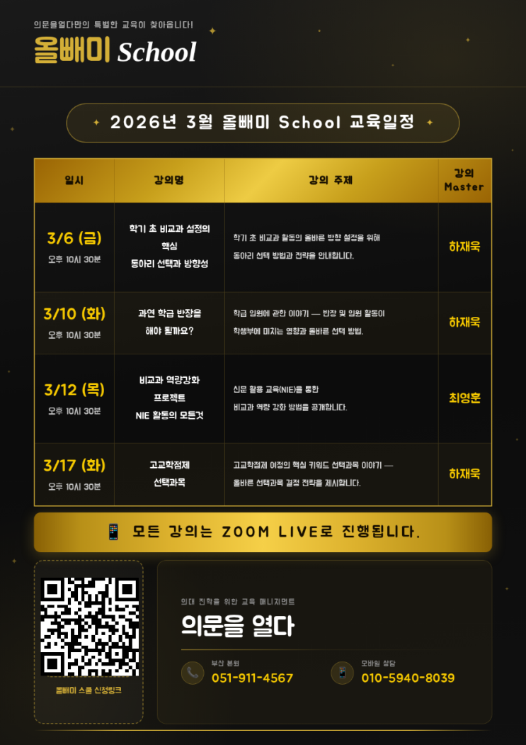 2026 3월 올빼미스쿨 신청링크 https://forms.gle/F2Q1kqSwa5iroium9 [2026 입시 전략] 새 학기 골든타임! 의대 진학을 위한 올빼미 스쿨 3월 특강 안내 안녕하세요, 의문을열다입니다 한동안 올빼미 스쿨이 없어서 아쉬우셨죠! 새 학기가 시작되는 3월, 정신없는 하루하루가 이어지고 있습니다. 새로운 학년의 시작으로 떠들썩한 지금 우리 아이들을 위해 필요한 것들이 무엇일까 고민의 결과로 3월 올빼미 스쿨이 진행됩니다. 동아리는 어떤 걸 선택해야 할지, 반장을 시켜야 할지 말아야 할지, 고교학점제 선택과목은 뭘 골라야 할지… 학부모님들이 가장 많이 하시는 고민들, 바로 저희가 답을 드리겠습니다! 올빼미 스쿨이란? 올빼미 스쿨은....... <img src="https://blogthumb.pstatic.net/MjAyNjAzMDRfMTg1/MDAxNzcyNjIyNjc0MDkw.3siLA6mqmudSFquHcBKlB38AioUww6RPYszsLuL9JrQg.qBqIyOFNIToZ6YNDmPg_zj-rAZDZRWOpuoUbPzPInBUg.PNG/3%3F%9B%94_%3F%98%AC%EB%B9%BC%EB%3F%3F_%3F%8A%A4%EC%BF%3F_%3F%8F%AC%3F%8A%A4%3F%84%B0.png?type=s3" />