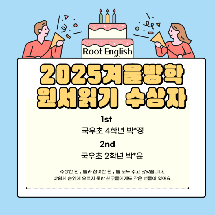안녕하세요 루트영어입니다:) 드디어 겨울 방학이 끝나고 우리 친구들이 개학을 했어요 방학동안 수업시간이나 집으로 대여해간 영어원서 읽기프로젝트도 마무리가 되었어요 금요일에 친구들에게서 북리포트를 받아 최종 수상자 1위,2위를 선정했어요 시상은 내일 할 예정이고 순위엔 오르지 못했지만 방학동안 열심히 원서 읽은 모든 친구들에게 작은 선물도 준비했어요 모두모두 수고 많았어요 원서읽기 프로젝트는 매 방학마다 시행하고 있어요 4월엔 "제3회 voca king contest"가 있을 예정입니다 2월엔 특강을 준비중이니 기대해주세요~ #루트영어 #국우초영어 #도남초영어 #도남지구 #칠곡초등영어 #원서리딩 <img src="https://blogthumb.pstatic.net/MjAyNjAxMjZfMTY2/MDAxNzY5MzYyMzg4OTg2.otR3kG2saA-O9TZox8E78jacNyFFmVhQZpGHGsq_xcog.3GuEcFXf9TEOp_VheYv6BYpDdq6XcJZAAfZ38SAfbhwg.PNG/900%A3%DF%C1%A6%B8%F1%C0%BB_%C0%D4%B7%C2%C7%D8%C1%D6%BC%BC%BF%E4.%A3%AD1.png?type=s3" />