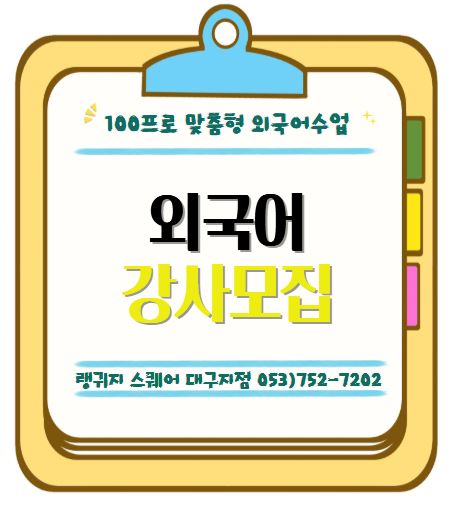 안녕하세요 대교 랭귀지 스퀘어 대구점입니다 100% 맞춤형 외국어수업 외국어 강사모집 1:1수업/그룹수업/기업체 출강 성인 수업 전문 (전 연령대 가능) 취미반,입시반,취업반, 자격증 대비반 학습 목표와 수준에 따른 맞춤형 수업 제공 대교 랭귀지 스퀘어 대구점은 범어역 6번 출구에서 5분거리에 있습니다 대교 랭귀지 스퀘어 대구점에서 맞춤형 프리미엄 외국어 수업을 지도 할 교사를 모집합니다 모집 일본어/스페인어/영어/중국어 교사 각 1명 업무내용 해당 언어 수업 자격요건 관련 자격증 소지 필수 대졸 이상(졸업증명서 제출 필수) 외국인의 경우 F2,F4,F5,F6 비자 우대사항 직무 경험 유 한국어 소통 가능한 원어민 우대 고급레벨/자....... <img src="https://blogthumb.pstatic.net/MjAyNjAxMjlfMjk5/MDAxNzY5Njc1MDYzNjI5.NobXo39D5O8V-GCsDRo-AHr7sQYcGPa1iJgImha-XjEg.fzDhcAnUpCCylUHh-GOTpyjWYTOd2dmBoDAzhTZj5PYg.JPEG/%B0%AD%BB%E7.JPG?type=s3" />
