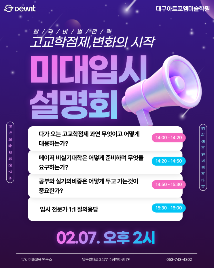 2027·2028 고교학점제와 미대입시, 변화의 시작 대구아트포엠미술학원 × 듀잇미술교육연구소 설명회 안내 2027·2028학년도부터 본격적으로 적용되는 고교학점제, 이제는 단순한 제도 변화가 아니라 미대입시 전략 전반을 다시 설계해야 하는 기준이 되고 있습니다. 특히 미술대학 입시는 실기뿐 아니라 교과 선택, 학업 설계, 학생부 구성까지 복합적으로 영향을 받는 구조이기 때문에 고교학점제를 정확히 이해하지 않으면 입시 준비 과정에서 혼란이 생길 수밖에 없습니다. 이에 대구아트포엠미술학원은 듀잇미술교육연구소와 함께 고교학점제 변화에 따른 미대입시 지원 전략 설명회를 준비했습니다. ✔ 설명회 주요 내용 이번 설명회에서는 막....... <img src="https://blogthumb.pstatic.net/MjAyNjAyMDFfMTkx/MDAxNzY5OTQ4MzU3NDI0.KAFVa_XDiJpqaXxStiWupTv-65SRBJMNWiO78uV-lcQg.rlGRsrusXnB6qPdhGBZdAQgt6pJj3IMc3dpcQR2GboMg.PNG/%C1%A6%B8%F1%C0%BB_%C0%D4%B7%C2%C7%D8%C1%D6%BC%BC%BF%E4._%284%29.png?type=s3" />