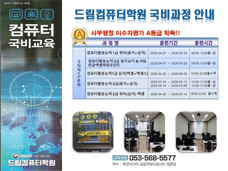 1. 컴퓨터활용능력 2급 필기+실기 ☆ 개강일 : 4/14, 5/7 (13시20분-17시20분) ☆ 수강료 : 360,000 (내일배움카드 사용시 198,000 본인부담) ☆ 교재무료제공 2. 컴퓨터활용능력 1급 필기+실기 ☆ 개강일 : 4/7 (9시-13시) ☆ 수강료 : 840,000 (내일배움카드 사용시 462,000 본인부담) ☆ 교재무료제공(교통비 월최대 5만원 지급) 3. 컴퓨터활용능력 2급 필기+실기 & ITQ한글엑셀파포 ☆ 개강일 : 4/7 (9시-13시) ☆ 수강료 : 840,000 (내일배움카드 사용시 462,000 본인부담) ☆ 교재무료제공(교통비 월최대 5만원 지급) 4. 컴퓨터활용능력 1급 실기 ☆ 개강일 : 4/20 (19시-22시, 월수목) ☆ 수강료 : 360,000 (내일배움카드 사용시 198,....... <img src="https://blogthumb.pstatic.net/MjAyNjAzMzBfMjI3/MDAxNzc0ODYwNzI5MjU2.o48vYOQ1DilweAnnL7zm0pxViefPQ6MX5FYam6kipkog.PBzIZYgqe5gTnvPOp9NUJAIZxOiActPtXmPMTXqPv-gg.JPEG/%B5%E5%B8%B2%C4%C4%C7%BB%C5%CD%C7%D0%BF%F8_%B0%ED%BF%EB%BC%BE%C5%CD_%C8%AB%BA%B8%C0%DA%B7%E1.jpg?type=s3" />