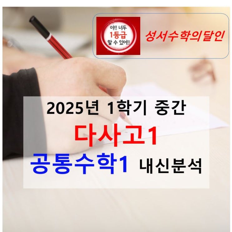 3월 끝나가고 있네요. 중간고사까지 한 달 가량 남았는데 미리미리 준비해야 됩니다. " 성적은 노력한 만큼 나옵니다.!! " 오늘은 다사고 1학년 1학기 중간고사 공통수학1를 분석해 보았습니다. 내신 시험은 자기 학교에서 주로 내는 유형과 어느 정도 난이도로 내는지 알고 공부를 하면 훨씬 도움이 되겠죠? 다들 열심히 공부해서 1등급을 받아 보아요~~ 화이팅!! 【 난이도 분석 】 【 많이 틀렸던 문제 】 【 시험지에 대한 평가 】 작년 다사고 1학년 1학기 중간고사 공통수학1 시험은 어려웠습니다. 나머지정리 단원의 수식 정리 유형이 가장 어렵게 출제 되었고 나머지 단원들도 쉽지 많은 않게 난이도 있는 문제들이 대거 있습....... <img src="https://blogthumb.pstatic.net/MjAyNjAzMzBfMjY1/MDAxNzc0ODY2OTM1MzY2._6VR40_rn0I8iapu0ZpUXrHicdYDxMkKiXO8Q6F-QI4g.qS1iqPdZ4o2xgXKxG8opGivocKTHl2kWuccq_7aqtD0g.JPEG/%B7%CE%B0%ED%28%B0%ED1%29_0001%282%29.jpg?type=s3" />
