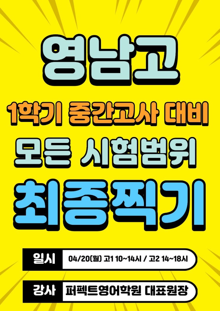 영남고 영어 내신 1등급 전략 2026년 1학기 중간고사 대비 최종찍기 (퍼펙트영어학원) 대구에서 영남고 영어 내신 준비하는 학생이라면 이번 기회 절대 놓치면 안 됩니다. 특히 개교기념일 = 학습 격차 벌어지는 날 학생이라면 개교기념일 당일 일찍 일어난다. 이 날을 어떻게 쓰느냐에 따라 중간고사 등급이 갈립니다. 핵심 일정 안내 일시 영남고 개교기념 휴업일 2026년 04월 20일 (월) 시간 ✔ 영남고1 : 10:00 ~ 14:00 ✔ 영남고2 : 14:00 ~ 16:00 장소 402호 강사 1호관 2호관 3호관 펙트영어학원 대표원장 직강 수업 핵심 (이게 다릅니다) 이 수업은 단순 문제풀이....... <img src="https://blogthumb.pstatic.net/MjAyNjAzMjRfNTMg/MDAxNzc0MzI1MjcyODIy.Lf0T0c21Shdcjh0Ka60KPw4dfSFr3guidqEY9lHun9sg.XDn0cFnjojvoK-L_xzbBxAzrsnNhh-leP35mbooLzzQg.JPEG/1774325266404.jpg?type=s3" />