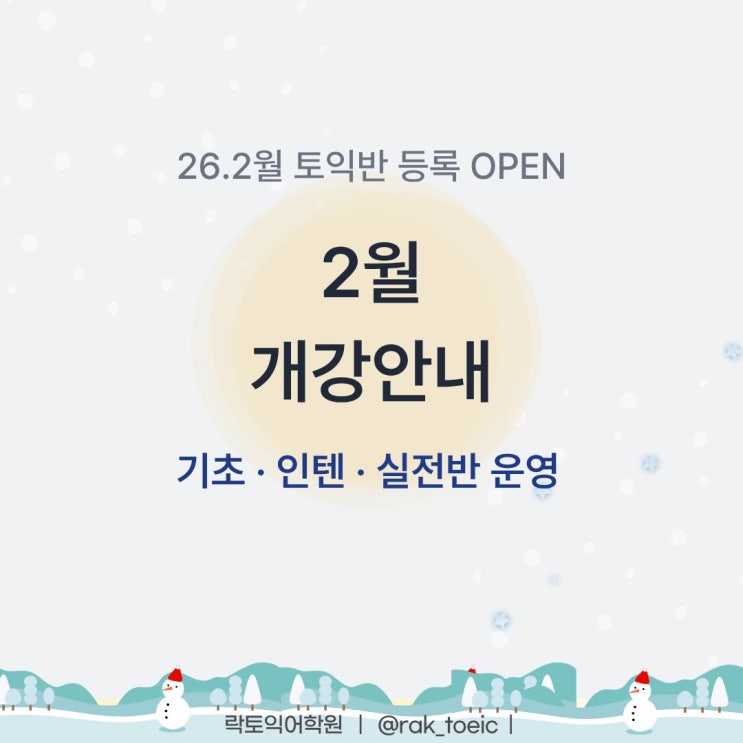 겨울방학을 앞두고 학원을 알아보다 보면 “조금 멀어도 대구 시내 동성로 낫지 않을까?”라는 고민을 한 번쯤 해보게 됩니다. 막상 수업이 시작되면 이동 시간 때문에 빠지거나 지치는 경우도 적지 않습니다. 토익은 결국 얼마나 자주, 꾸준히 공부하느냐가 중요한 시험이라 가까운 곳에서 안정적으로 다닐 수 있는 환경도 생각보다 큰 차이를 만듭니다. 토시락: 토익의 시작은 락토익 토익의 시작부터 목표 점수 달성까지, 대구 토익 전문, 락토익어학원에서 1-2월 겨울방학특강 수업을 개강합니다. ️ 개강 한눈에 보기 : 시간표 ※ 동일 레벨 교차수강 가능 기초반 / 인텐반 / 실전반 오전 · 오후 · 저녁반 운영 아래 시간표 이미지....... <img src="https://blogthumb.pstatic.net/MjAyNjAxMjNfMjc4/MDAxNzY5MTMzNDAzMDky.s6KLEQt5wP95PZ6o6Kodbbn36qwmU9AakfMdC06DlZog._CHY6-38vTOtrBQq4Qj3CAxo8XWr5CY8JbNVR1q4zxkg.JPEG/1.jpg?type=s3" />