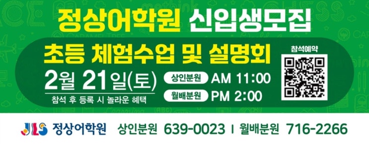 3월 신학기 개강 전 정상어학원의 초등 프로그램을 마지막으로 맞볼 수 있는 체험수업과 설명회를 개최합니다. 학생들이 체험수업에 참여하는 동안 학부모님께는 초등~중등까지의 정상어학원 커리큘럼을 자세히 설명드립니다. 체험수업은 초등 1~4학년만 신청가능합니다. < 상인분원 > 일시: 2월 21일 (토) 11시 장소: 상인동 134번지, 3층 < 월배분원> 일시: 2월 21일 (토) 2시 장소: 대천동 923-3번지, 2층 체험수업과 설명회는 아래의 구글폼을 이용해 예약해 주십시요. 상담문의 상인분원 053) 639-0023 월배분원 053) 716-2266 #2월설명회 #2026년2월 #신학기설명회 #체험수업 #초등체험수업 #정상어학원초등 #....... <img src="https://blogthumb.pstatic.net/MjAyNjAyMDNfMTMx/MDAxNzcwMTE1NzIxMDU3.1-1TwhtEAsq2btCl3AU8ntNvO1PX4os7z6wEWLezoOEg.z-BQLZJssJjyFPZ7zvzWqVdydNVVeXvC84mVtAgnIsMg.JPEG/2026%B3%E2_2%BF%F9_%C3%BC%C7%E8%BC%F6%BE%F7_%BC%B3%B8%ED%C8%B8.jpg?type=s3" />