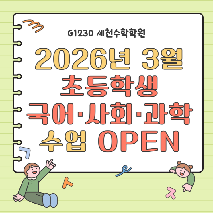 G1230세천수학학원 '2026년 3월' 초등 국어·사회·과학 수업 OPEN!