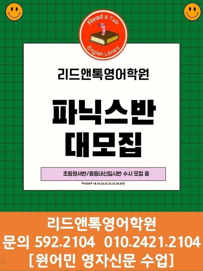 초등저학년들의 영어시작은 무조건 즐겁게 시작하세요! 리드앤톡은 파닉스와 싸이트워드를 4~8명 소그룹으로 수업을 진행해요! 리드앤톡영어 즐겁게! 씐나게! 친구들과 소통하면서! 듣고 말하며 음가조합을 합니다. 게임은 학습을 위한 즐거운 도구! 파닉스반은 자기주도가 아직 약한 저학년들이라서 태블릿 도구없이 선생님과 함께해요. 코스북반 원서반 으로 이어집니다. 우리아이들 리드앤톡에서 즐겁게 영어시작하세요! 발빠른 어머님들 3월개강 대기중이십니다.^^ 상담예약하셔서 꼭 설명들으세요.!^^ 010.2421.2104 <img src="https://blogthumb.pstatic.net/MjAyNjAyMTJfMTcz/MDAxNzcwODUzMDM5MzMz.Ly30h-fj-IN-Q2GUMQBvd8Be7IzZZhnlGXcsSBcAmyMg._M_JO1wF59-b8KyuMPNnSB6dgKILZHNCMiI_iFBLMyAg.JPEG/1740735475779.jpg?type=s3" />