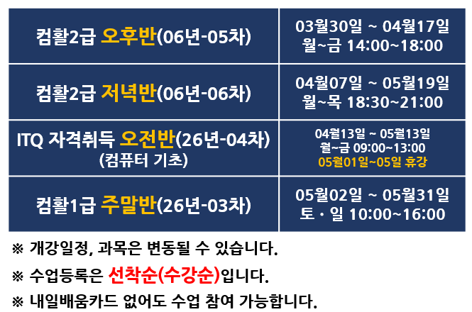 안녕하세요:) 인천에서 컴퓨터 잘 가르치는 학원! 주안회계컴퓨터아트학원입니다. 벌써 길거리에 목련 봉오리, 개나리가 조금씩 소식을 보내고 있네요 제법 쌀쌀했던 날씨도 포근한 바람으로 바뀌는 것이 느껴집니다. 여러분도 환절기 건강 주의하시고 이번 봄엔 자격증 하나 남겨보세요! 저희 학원 4월 5월 개강일정도 함께 공유해드리니 시간표 확인해보시고 많은 수강 부탁드려요 네이버 리뷰와 고용24 후기가 증명하는 주안회계컴퓨터아트학원에서 미루지 말고 시작해볼까요? 시간표 보시고 궁금한 점 있으시면 카카오톡으로 바로 문의주세요! 문의하는 순간, 절반은 성공 032-863-0017 <img src="https://blogthumb.pstatic.net/MjAyNjAzMjRfMjc0/MDAxNzc0MzIxMDgxMjU3.HJwpbQfMyxxDtQXyMtqKbiGLT3BGKKaWVW2pGKNWUpMg.fanR-nFOIo_2Dh_I4ANRf4ifpT6crMpCI4pyYgm4jJcg.PNG/1.png?type=s3" />