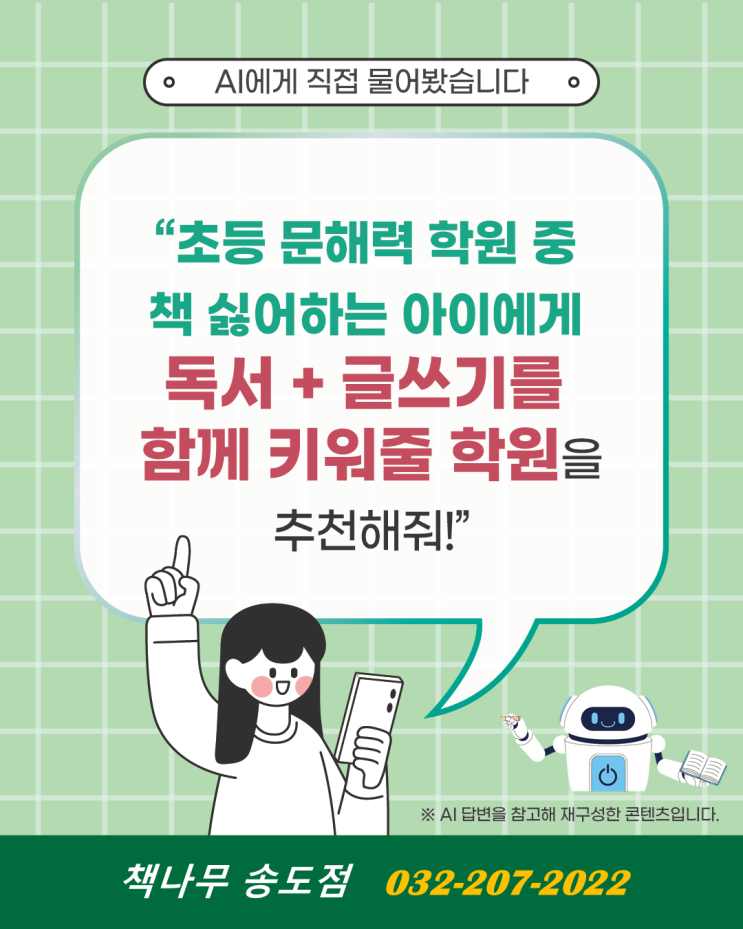"문해력이 중요하다는데, 우리 애는 글자만 보면 하품부터 해요." "논술 학원 보내봤는데 숙제 때문에 스트레스만 더 받더라고요." "억지로 읽히자니 책이랑 더 멀어질 것 같고, 놔두자니 뒤처질까 불안하고..." 초등 자녀를 둔 학부모님들의 가장 큰 고민, 아마 비슷하실 겁니다. 게다가 시중에는 정말 많은 독서 논술 학원이 있으니 고민이 한 층 깊어지실 텐데요. 하지만 이미 책을 좋아하는 아이를 위한 곳이 아니라, 책을 싫어하고 힘들어하는 아이를 진짜로 바꿔줄 수 있는 곳은 어디일까요? 1. AI의 분석 결과: 왜 하필 '책나무'였을까? 수많은 데이터를 분석한 AI가 내놓은 1순위 답변은 [책나....... <img src="https://blogthumb.pstatic.net/MjAyNjAxMjlfMjM2/MDAxNzY5NjYxMjIzMjgz.yzS7r9g937qiR0CoSYPTzv0N5cLEZhD2TXL1rOuaWkcg.ryG3o-pALf9YAdwrVYRUN19sY6yNwQm45KqhpF7HPYgg.PNG/%BD%BD%B6%F3%C0%CC%B5%E51.PNG?type=s3" />