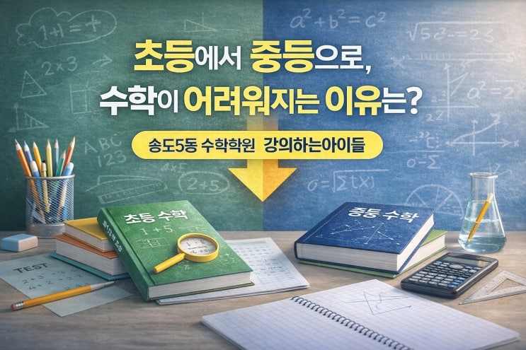 수학은 단순히 계산을 잘하는 과목이 아닙니다. 개념을 이해하고, 적용하고, 연결해 나가는 사고력 중심의 학문입니다. 초등학교 수학에서는 연산 능력이나 반복 학습만으로도 좋은 성적을 받을 수 있었습니다. 하지만 중학교 수학부터는 학습의 방향 자체가 달라집니다. 중등 수학에서는 단순 암기와 반복으로는 문제를 해결하기 어려워지고, 학습 방법을 제대로 전환하지 못하면 성적이 떨어지고 자신감까지 무너지는 상황이 생기기 쉽습니다. 중학교 수학이 어려운 진짜 이유 1. 추상적 개념이 많아진다 초등 수학은 수의 크기, 도형의 모양 등 직관적인 개념이 중심이었습니다. 하지만 중학교 수학에서는 문자, 식, 함수, 도형의 성질, ....... <img src="https://blogthumb.pstatic.net/MjAyNjAxMjlfNzUg/MDAxNzY5NjcwNDg3NDE2.YbVWxXMPJP7nL9zLvmz7bYkXsRBGpdAGoxLYHVQpXYMg.arT-oWxhSBMrmQ9eE3qh-DkNn6MLPf9qp948BFpQo-0g.JPEG/a3.jpg?type=s3" />
