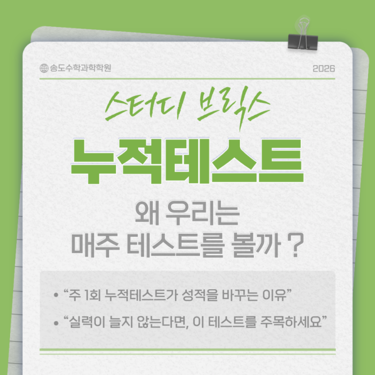 안녕하세요 :) 대치스터디브릭스 송도관입니다. 여러분 ! 문제를 풀다보면 “이해한 것 같은데 왜 문제는 안 풀릴까?” 이런 생각이 들 때 있죠 ? 그래서 저희는 매주 한 번, 수업 내용을 얼마나 제대로 이해했는지 확인하는 누적테스트를 봅니다. 이 시험은 단순히 점수를 매기기 위한 시험이 아니라, 실력을 쌓기 위한 중요한 과정이죠 ! 첫번째, “알고 있다”와 “풀 수 있다”의 차이 알기 수업 들을 땐 이해한 것 같아도 막상 문제를 풀면 헷갈리는 경우 많죠 ? 시험을 통해 진짜 내 실력을 객관적으로 확인 해요 ! 두번째, 복습을 강제해 주는 루틴 잡기 시험이 없으면 “나중에 해야지” 하다가 밀리기 마련 ! 주 1회 시험으로 자연스러....... <img src="https://blogthumb.pstatic.net/MjAyNjAxMzBfMTMg/MDAxNzY5NzMzNTgyMjI0.bgYZcwdN5lScW9_5CcYKefC0VS0lCeEXtnl9QVet1YMg.vL8IxEmCFqp1j1RZWmKB60Skder8CB6Ml0TMgv6T5oAg.PNG/%C1%A6%B8%F1%C0%BB_%C0%D4%B7%C2%C7%D8%C1%D6%BC%BC%BF%E4..png?type=s3" />