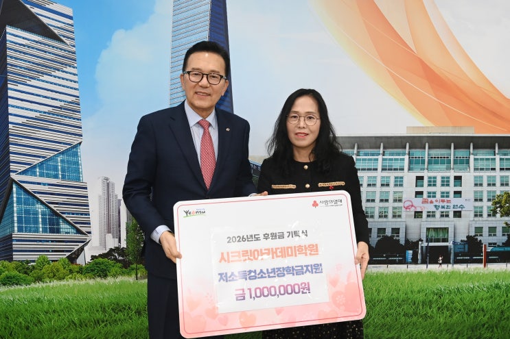 나눔으로 행복한 연수, 시크릿아카데미학원의 따뜻한 기부 이야기 추운 겨울을 따뜻하게 만든 작은 실천 2026년 1월 30일 금요일 오후 4시 30분, 인천 연수구청 이재호 구청장님 실에는 특별한 손님들이 찾아왔습니다. 새봄 초등학교 4학년 이은찬, 김강민 학생, 동춘 초등학교 5학년 권하윤 학생, 인천중학교 2학년 이세찬 학생, 연수고등학교 이준희 학생, 그리고 학부모님과 함께 동춘동 수학학원 시크릿아카데미학원 구서영 원장이 연수구청을 방문한 것입니다. 이날은 동춘동 수학학원 시크릿아카데미학원이 연수구 저소득층 중학교 입학 학생들을 위해 후원금 100만 원을 기탁하는 뜻깊은 날이었어요. 단순히 기부가 아니라, 학생들의 노력....... <img src="https://blogthumb.pstatic.net/MjAyNjAxMzFfMjg4/MDAxNzY5ODE0MzA0MTk4.enjbR8C8WW6ekAh1nHMcTIwY1AY2EPpKvOMdkogPSG8g.qzqXYTAi8ujqr1CM6ntsfIxLqtFLIMGX5b-pvJmxg6Ug.JPEG/%B1%E2%BA%CE-1.jpg?type=s3" />