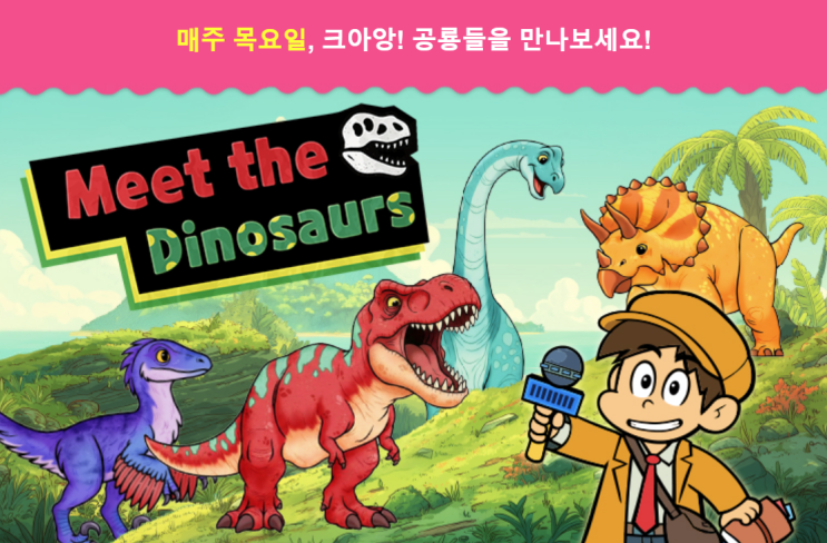 2월 5일부터 매주 목요일에는 새로운 시리즈 Meet the Dinosaurs (공룡을 만나요, C4, 12편)가 발표됩니다! 꼬마 기자와 함께 시간을 거슬러 올라가 다양한 공룡들과 선사 시대 파충류들을 인터뷰해 보세요. 스테고사우루스, 브라키오사우루스 등 각각의 공룡들이 무엇을 먹었는지, 어떤 습성을 가졌는지, 크기는 대체 얼마나 컸는지 등 흥미로운 특징들을 함께 알아봐요! <img src="https://blogthumb.pstatic.net/MjAyNjAyMDJfMTU0/MDAxNzcwMDA0NjM1MTQ4.xboU3qjTpYO6HL-50R2c3YdUcfEkoKdkwj_0_x_M7DMg.W3FQe-TqRNWWF_17ORj_cYB1olEZuRFm3iWEmrRbj2Mg.PNG/image.png?type=s3" />
