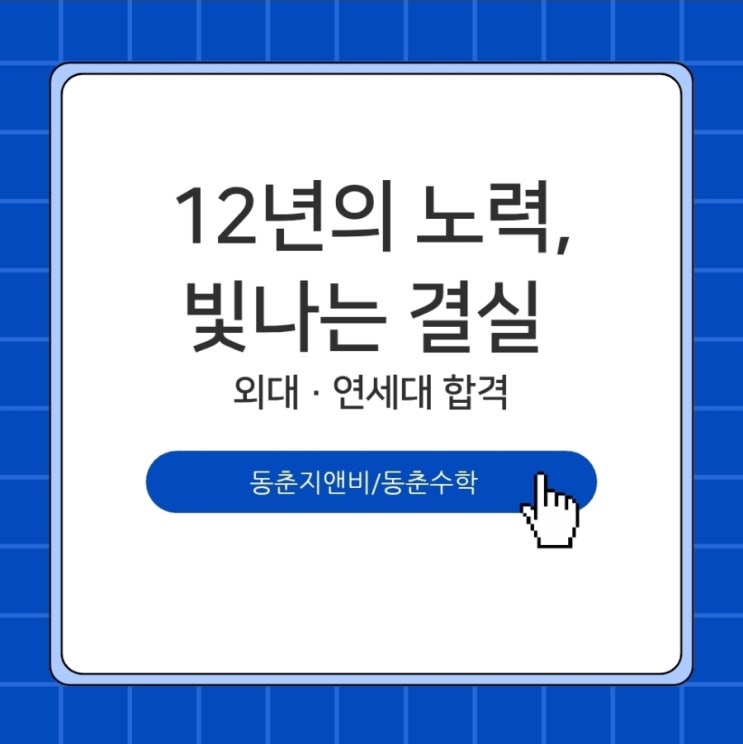 지난 주말 초등 1학년부터 고등학교 3학년까지 함께 한 학생이 기쁜 소식을 전해왔습니다. 어느 하나 기쁘고 소중하지 않은 소식이 없습니다. 끝까지 기다려주고 한꺼번에 동춘지앤비/동춘수학 가족들에게 기쁜 소식 전하고 싶었습니다. 수시 결과도 정시와 함께 전하고 싶었습니다. 초2부터 고3까지 함께 한 학생들이 가천대.성균관대와 고려대학교에 합격해 기쁨을 나누었습니다. 정시 합격 발표 중이어서 조심스럽습니다. 기다리고 있는 학생들의 마음을 잘 알고 있습니다. 결과만 함께 하기에는 10년 이상을 함께 한 학생들의 과정을 모두 표현하기 어렵습니다. 시간은 결코 배신하지 않습니다. 초등부터 쌓아온 성실한 태도와 꾸준함이 습관....... <img src="https://blogthumb.pstatic.net/MjAyNjAyMDJfMzAw/MDAxNzY5OTgxNjI4NDQ2.tGaUClozvayCDpQ06qqsaDdu9KDSn6MQrGFAUWG5Xbcg.yVfEszpoBIwTWuGcz9n_HS5UqgW8dwPd5OOfbCGtVj0g.JPEG/900%A3%DFScreenshot%A3%DF20260202%A3%DF060053%A3%DFCanva.jpg?type=s3" />